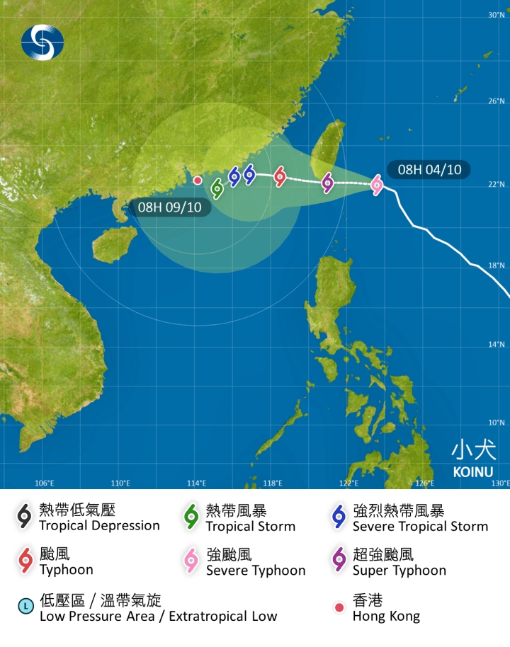 The weather watchdog said Koinu is expected to move across the southern part of Taiwan towards the coast of eastern Guangdong. It will then move westwards, edging closer to the vicinity of the Pearl River Estuary.