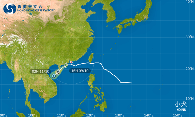 Koinu was centered about 210 kilometers west-southwest of Hong Kong at 4 pm and is forecast to move southwest at about 14 kilometers per hour across the western coast of Guangdong and weaken gradually.
