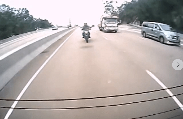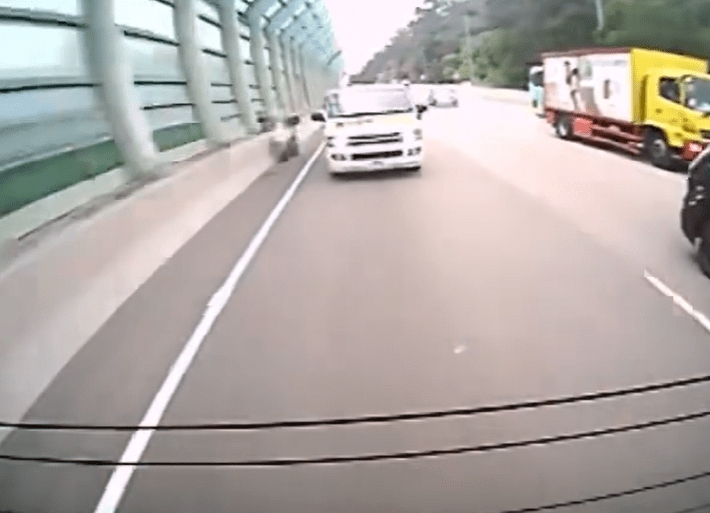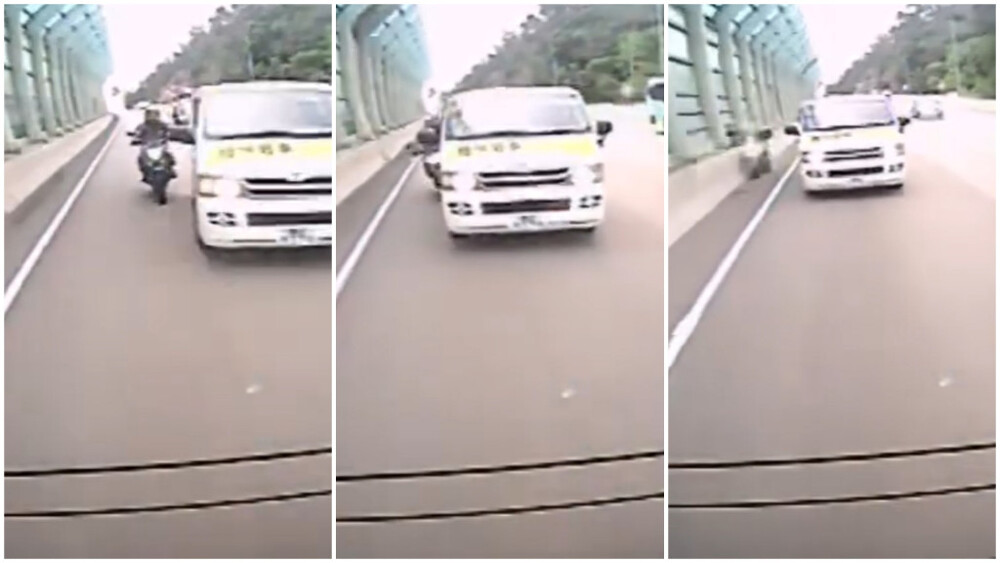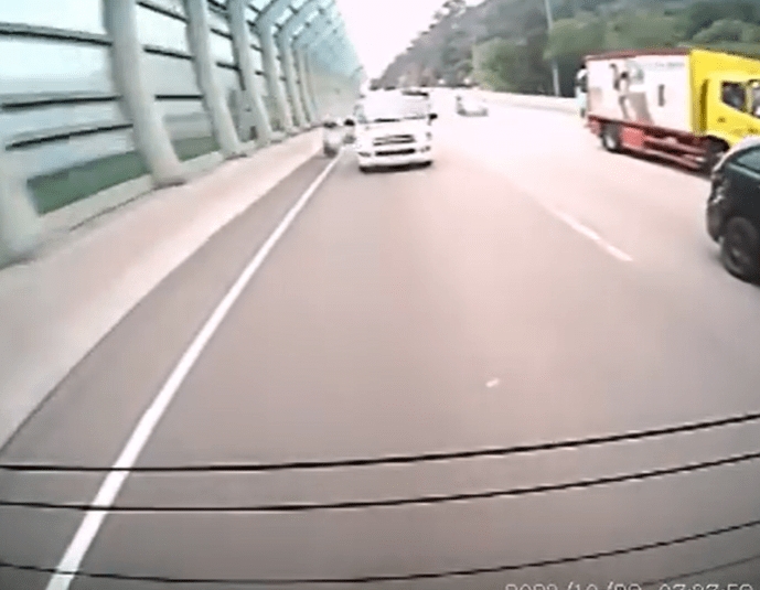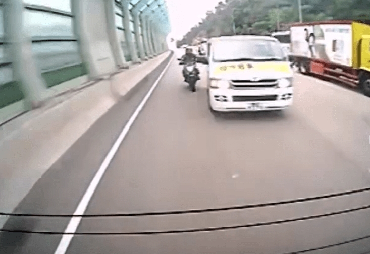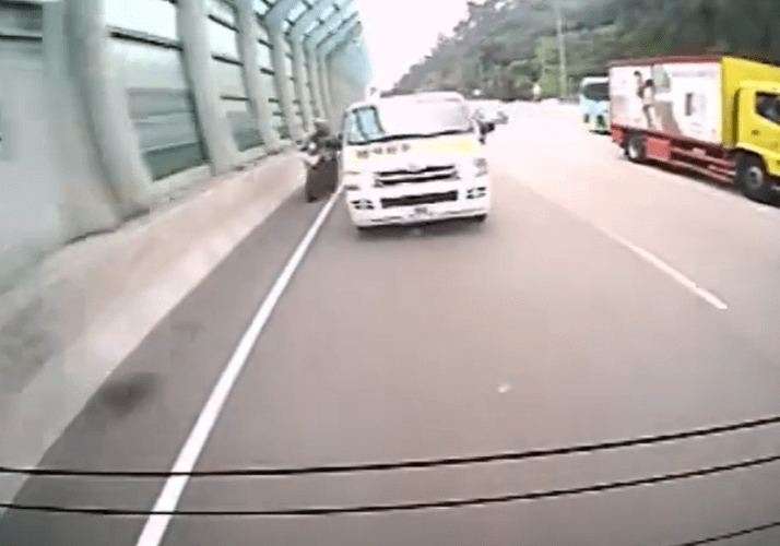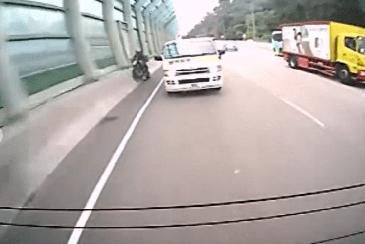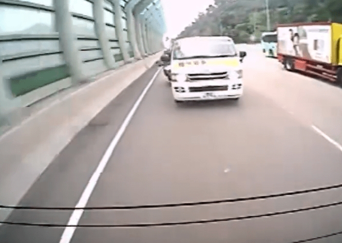 The crash occurred around 7.32 am today on the Kowloon-bound section of Tuen Mun Road. The biker was traveling in the fast lane on the right but the van on his left suddenly cut into his lane and hit him.