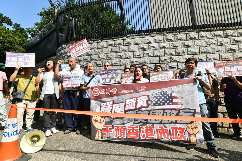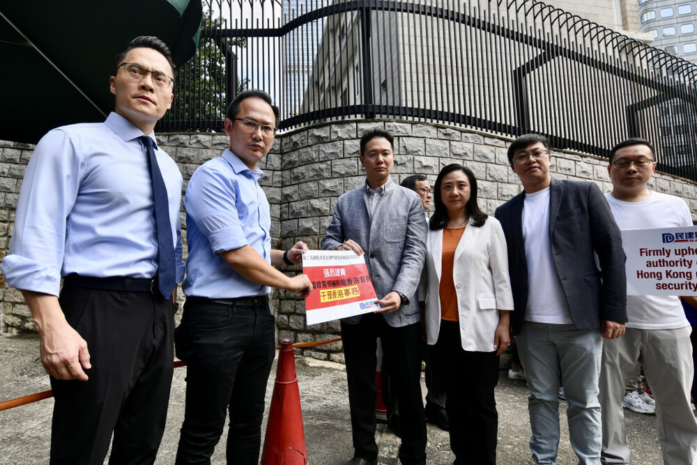 Legislators from multiple political parties demonstrated outside the US Consulate in Hong Kong regarding some US lawmakers' attempts to put city officials, judges, and prosecutors on a so-called "sanction list."