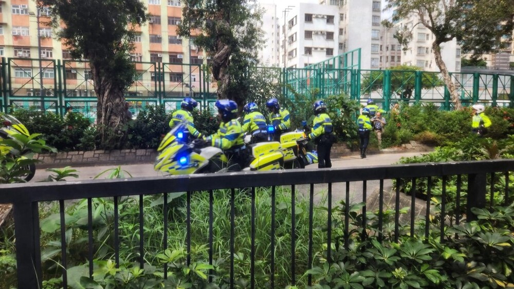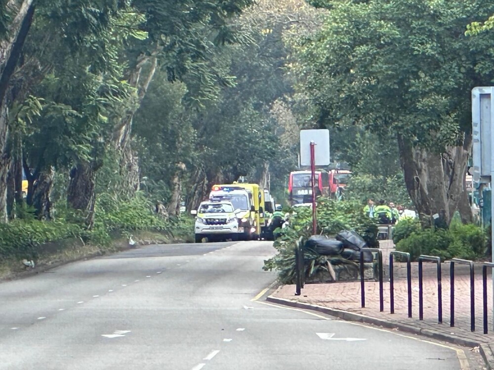 Around 12 pm today, the traffic police were on their motorcycles driving towards Sha Tau Kok along the Lung Yeuk Tau section of the Sha Tau Kok Road, when one of the motorcycles in front suddenly ran into some issues as it got near Luen Wo Hui playground.