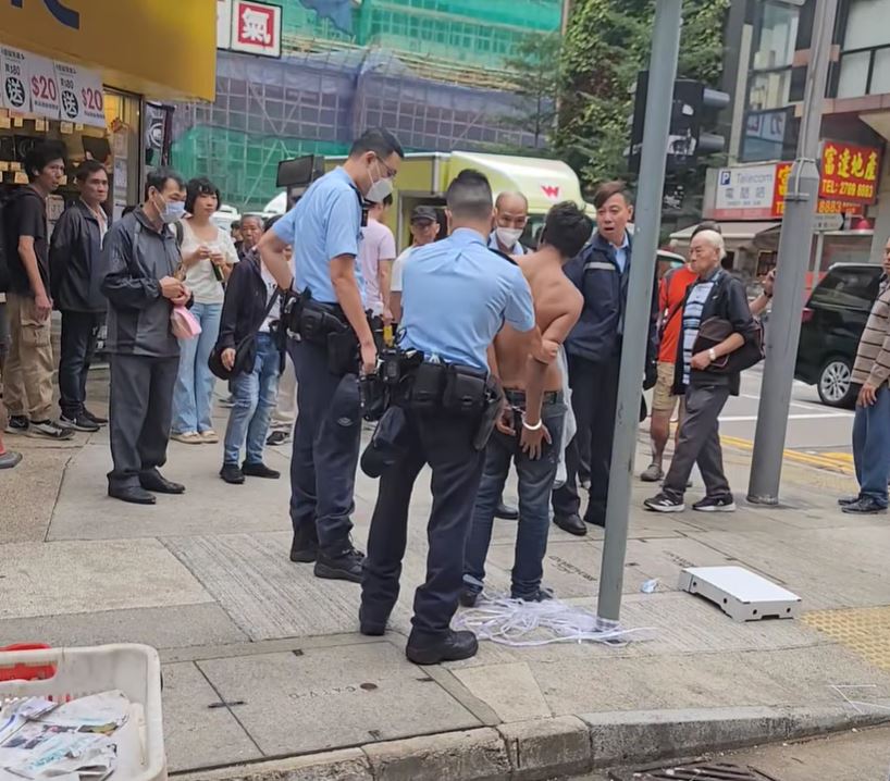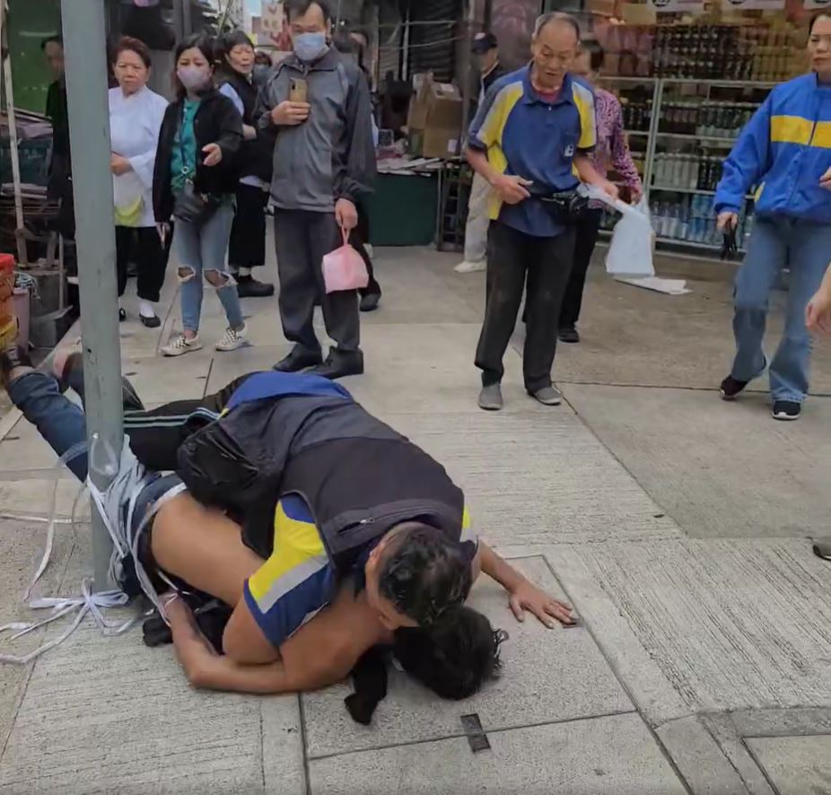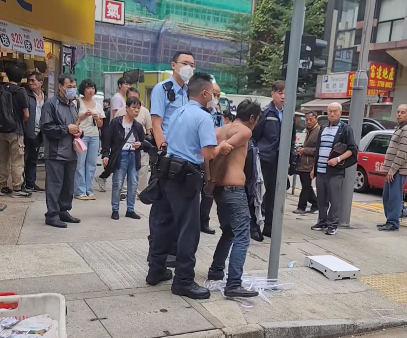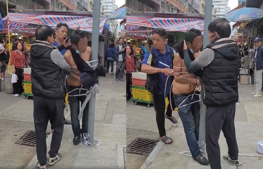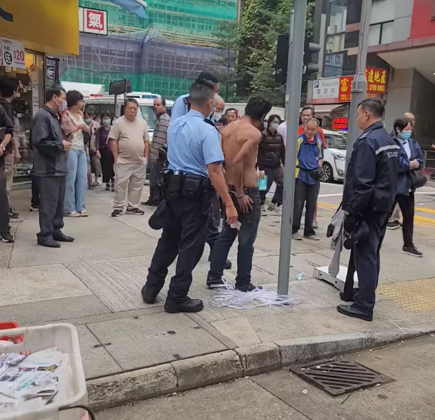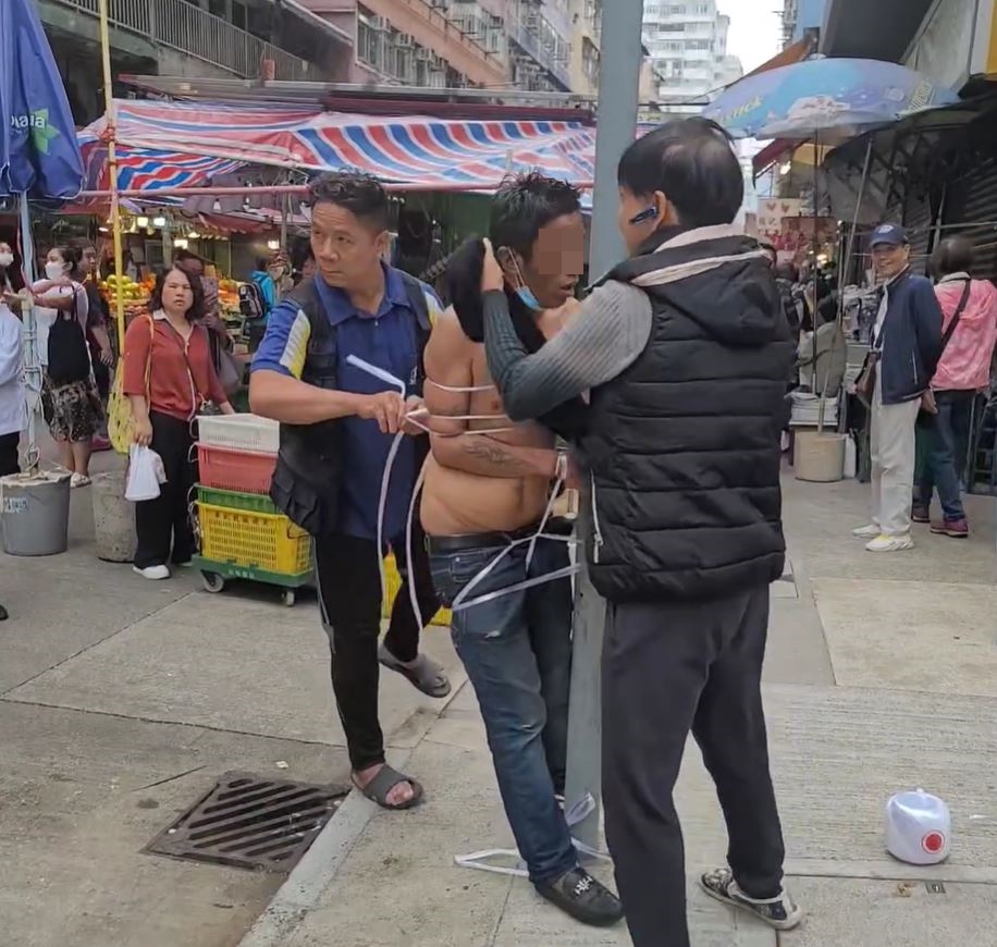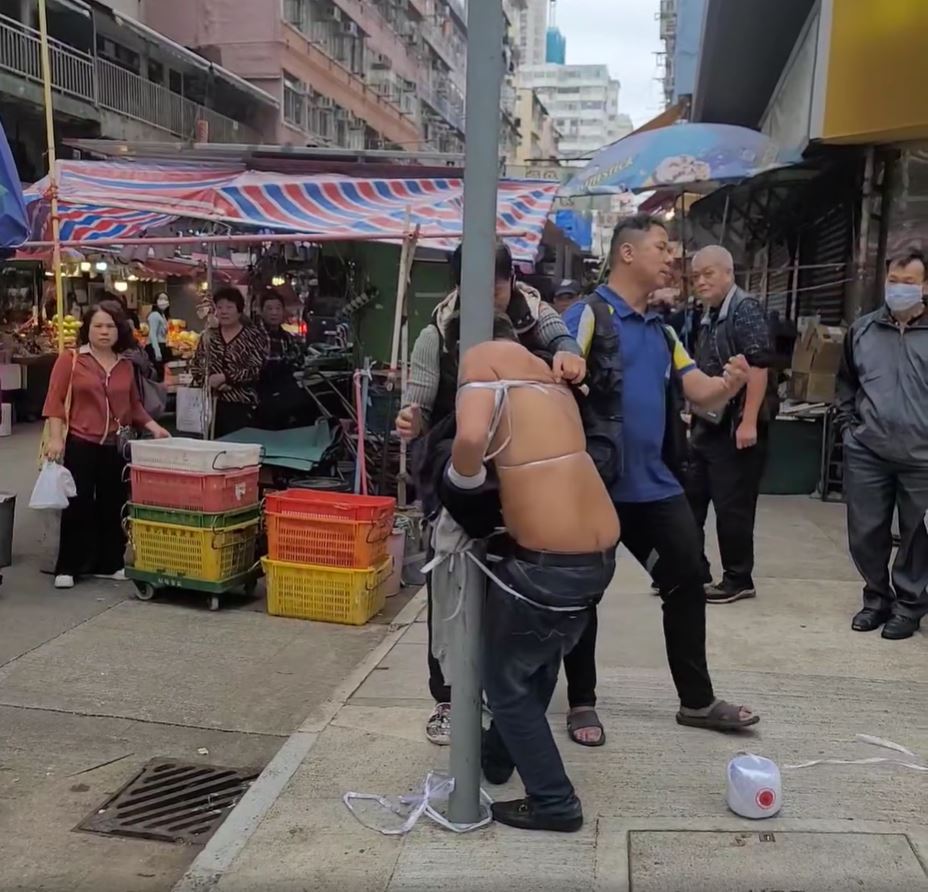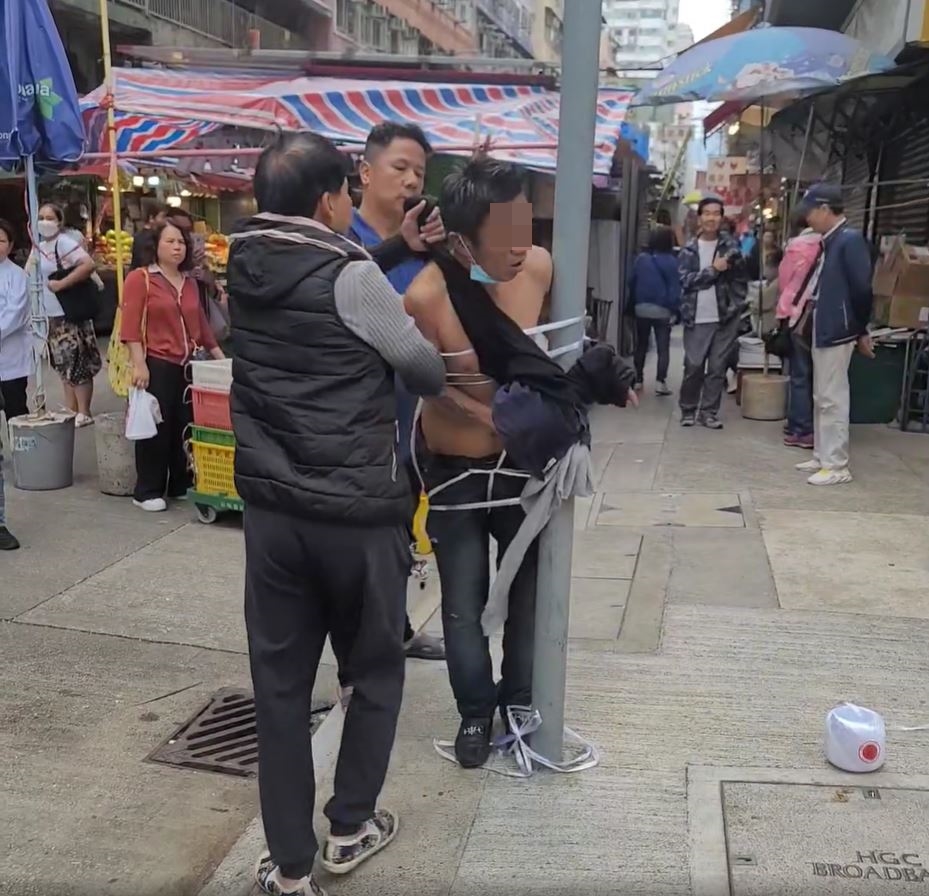 A 44-year-old shirtless man was tied to a street sign by pedestrians after he was caught trying to steal four bottles of shampoo worth some HK$200 from a Mong Kok store on Wednesday morning. Police later arrived and arrested him for theft.