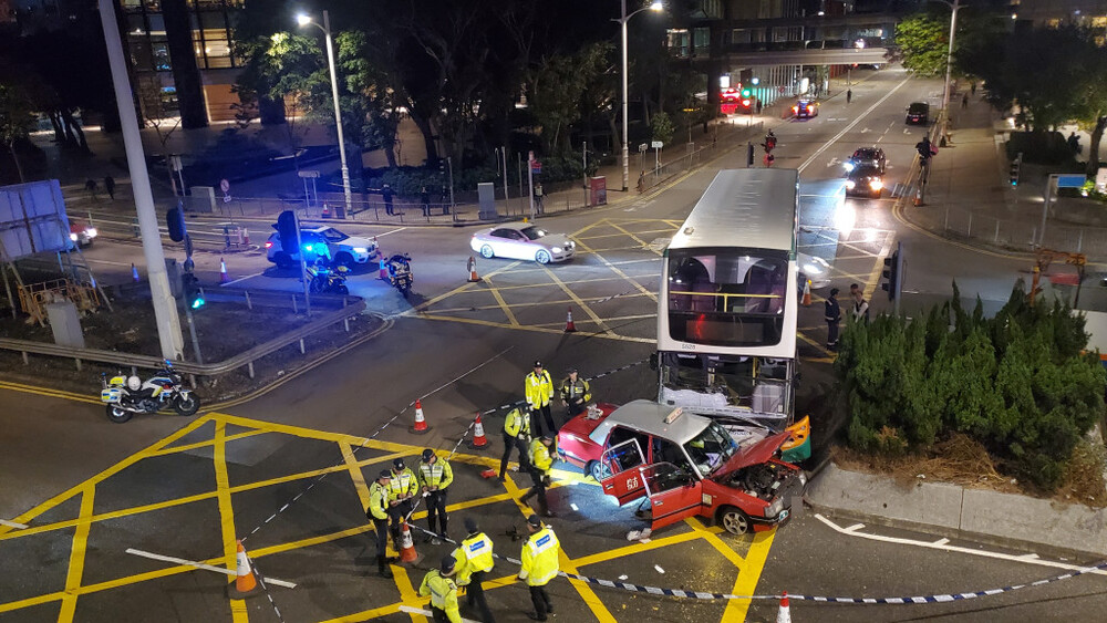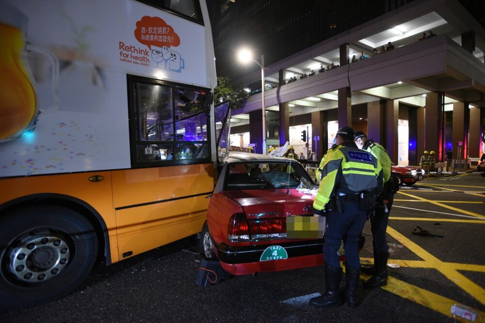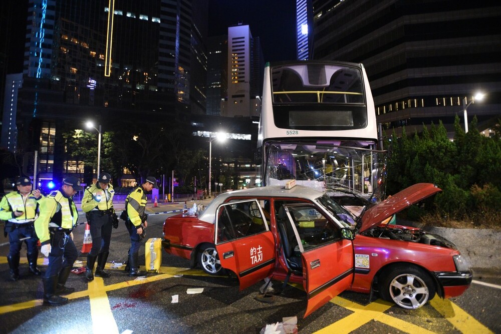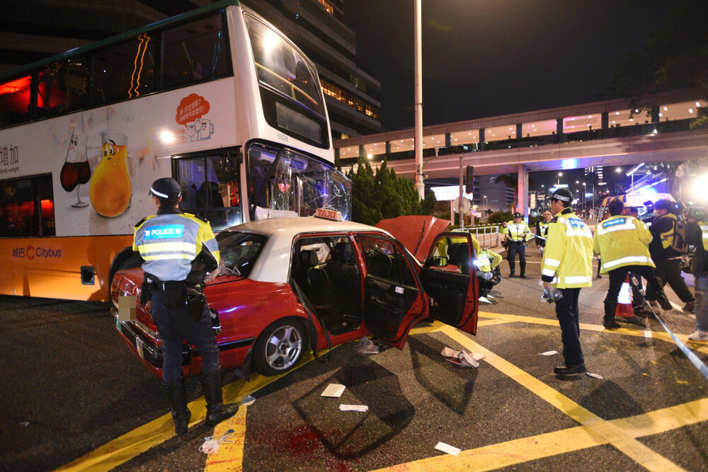 The accident happened at around 9.30 pm yesterday when the taxi was traveling along the Fleming Road flyover and was hit by a Citybus double-decker when it reached the junction at Harbour Road.