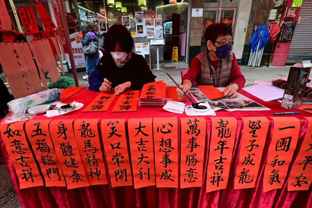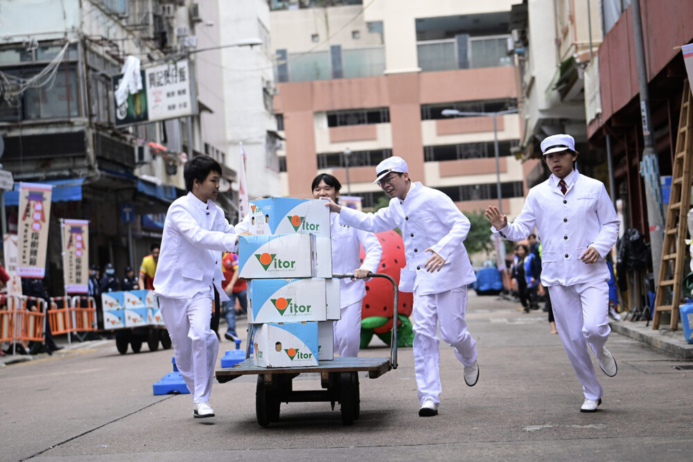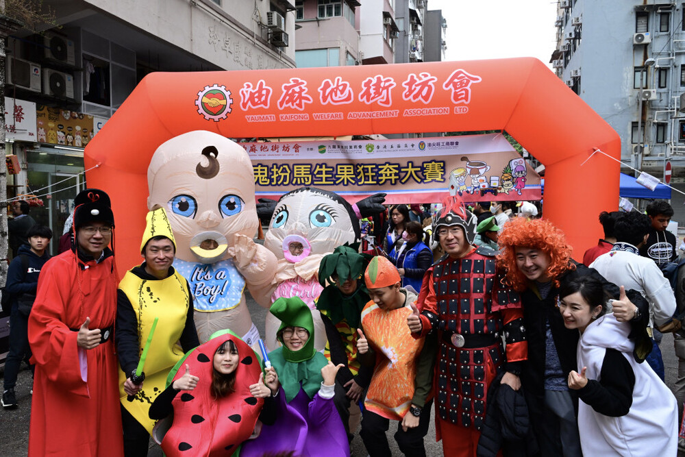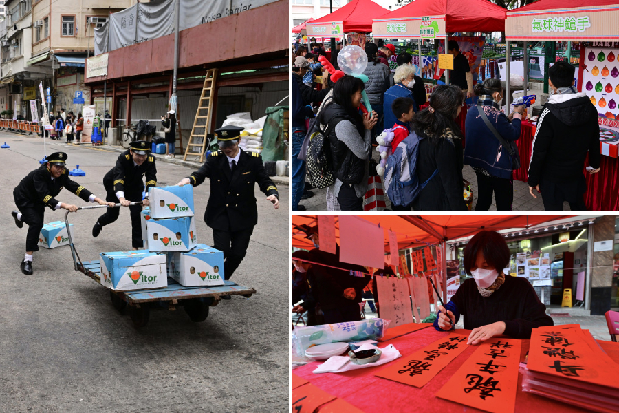 The events also feature spring couplet (Fai Chun) writing, fortune-telling, and the traditional wooden cart competition - the flagship activity - with runners dressed in fun costumes to push a wooden cart that is usually seen at the Yau Ma Tei Fruit Market to reach the finishing line.