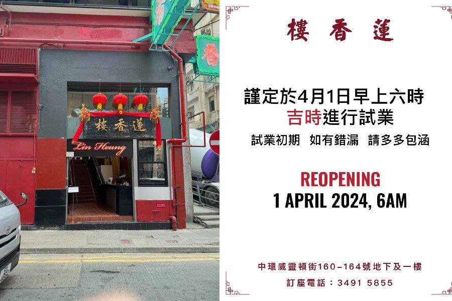 Lin Heung Lau, an old-fashioned teahouse that closed in 2022 due to the COVID-19 pandemic, announced that it was reopened for trial operation at its original location in Central yesterday (April 1) and will officially open next Monday (April 8).
