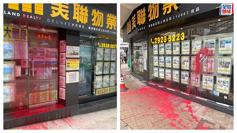 Two more Midland Realty branches in Causeway Bay and Tai Hang were doused with red paint on Sunday morning after the North Point branch of the property agency was doused with red paint last Tuesday (May 7).