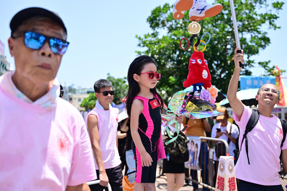 Several Piu Sik sets used the anti-scam campaign as the theme. Children dressing as star fencer Edgar Cheung Ka-long, "flying fish" Siobhan Haughey and anime characters are also seen in the parade.