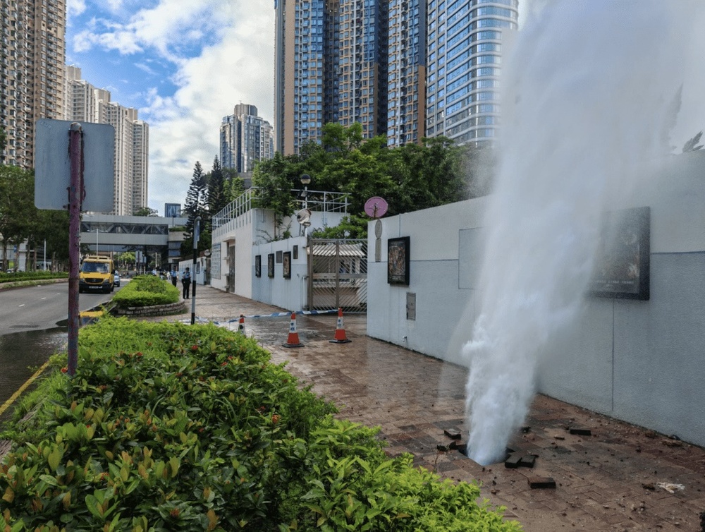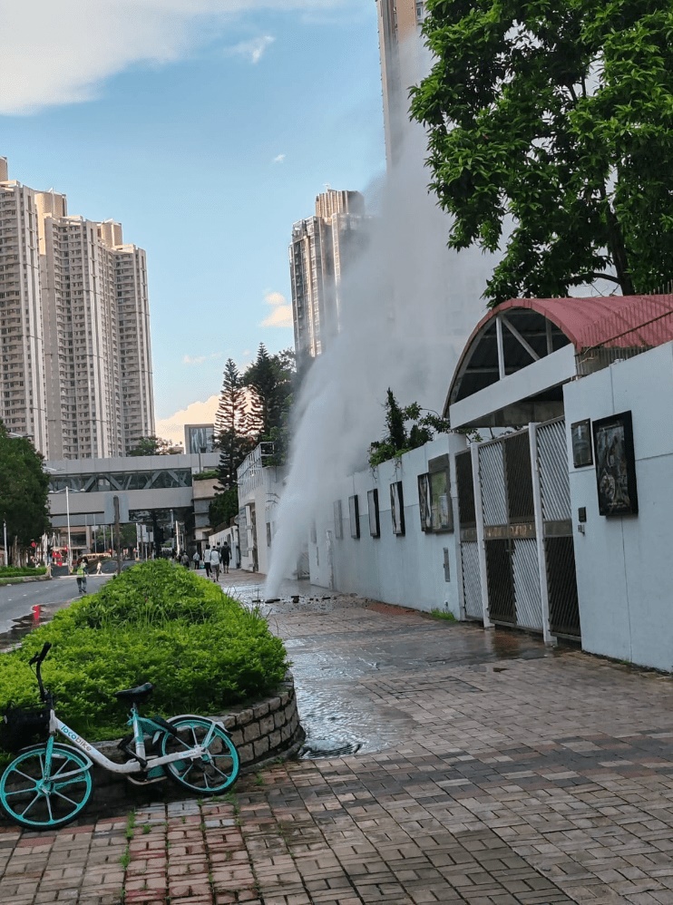 A water pipe burst in Tseung Kwan O, drenching the front of a school with a large amount of water on Friday morning.