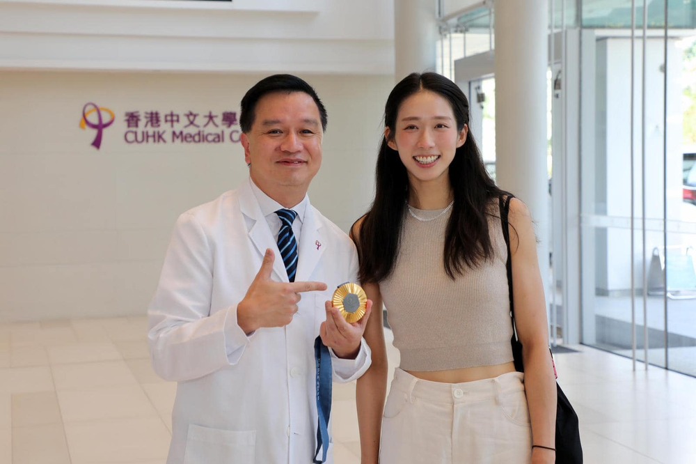 Olympic gold medal-winning Hong Kong fencer Vivian Kong Man-wai visited the CUHK Medical Centre on Friday, the second day after she made a triumphant return to Hong Kong, thanking Patrick Yung Shu-hang, Clinical Director of Orthopaedics & Traumatology and other rehab staff for their support.