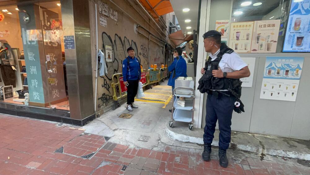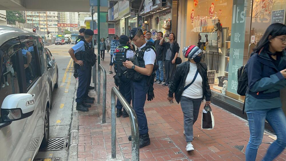 At around noon today, police officers in tactical vests were seen searching for the suspect in Mong Kok. Some officers can be seen holding a picture of the suspect when canvassing buildings in the area.