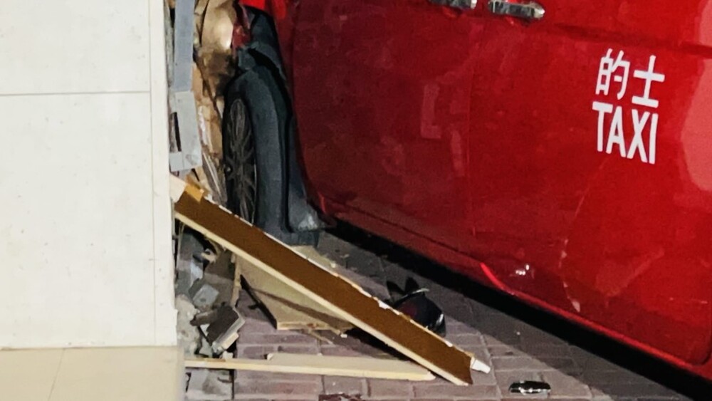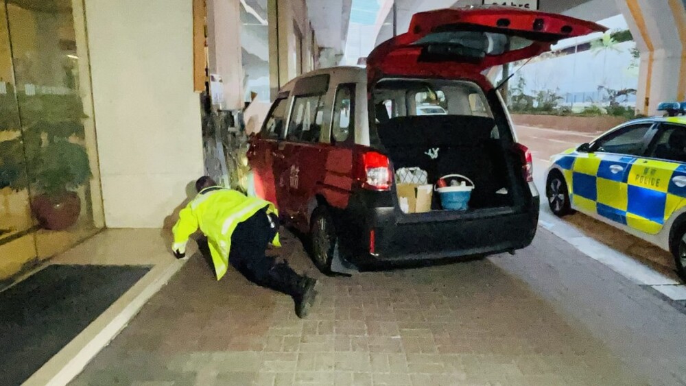 Shortly before 5 am today, a motorist passing through Trademart Drive near the Kowloonbay International Trade & Exhibition Centre (KITEC) found a cab mounted on the pavement after having crashed into the KITEC wall and immediately reported it to the police.