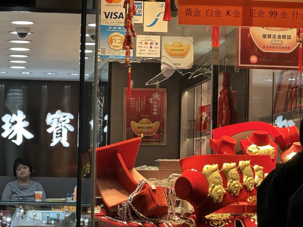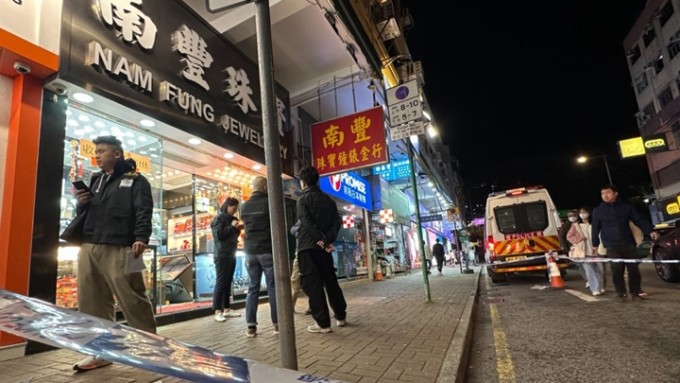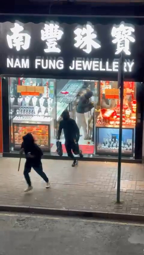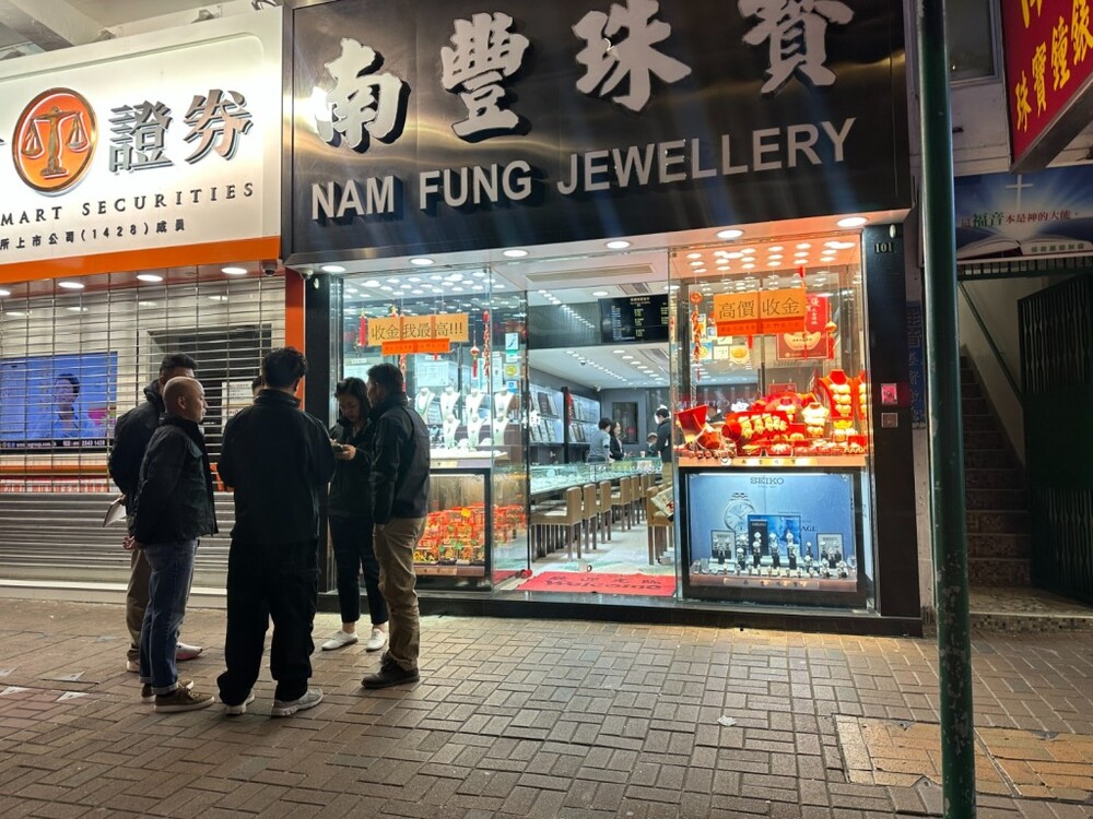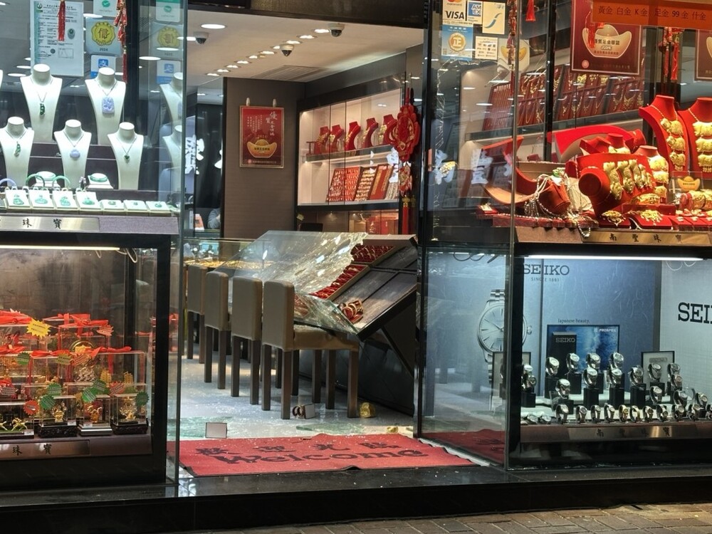 Four robbers armed with knives and hammers stormed a jewelry store on San Fung Avenue in Sheung Shui at around 6.30 pm yesterday, making off with valuables and fleeing in a car that later crashed in Tai Po.