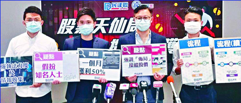 The pro-establishment party urged police and the Securities and Futures Commission to investigate, claiming its own undercover operation found that the scams could constitute criminality such as fraud and manipulation of stock prices.