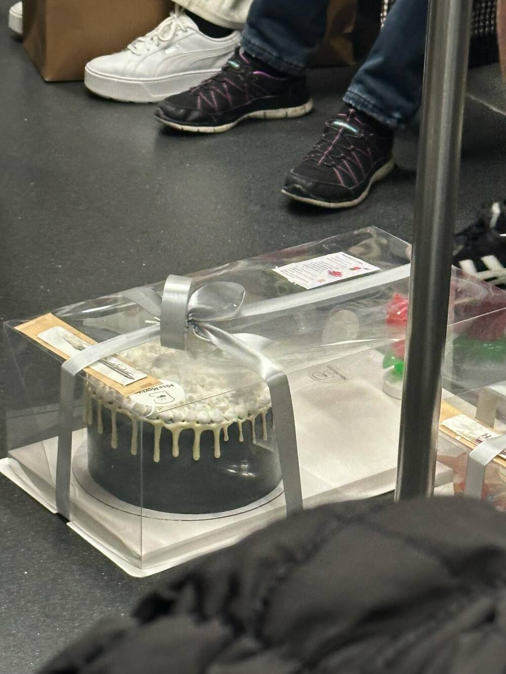 According to the photos, the cakes in transparent boxes are seen placed directly on the floor, with no thermal bags in sight.