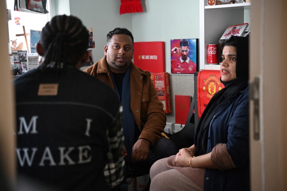 Uzma Naveed (R), an outreach coordinator, and social worker Jeffrey Andrews (C) speaking to ‘John’ (L) at the Christian Action Centre for Refugees in Chungking Mansions in Hong Kong. (AFP)