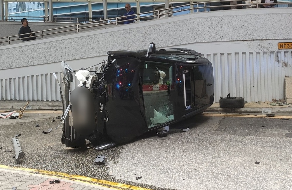 At 2.27 pm today, the vehicle was driving along on Sha Tsui Road in Tsuen Wan, but when the sedan neared Discovery Park, it lost control, struck road signs, and overturned onto its left side, sustaining damage to the front right of the vehicle.