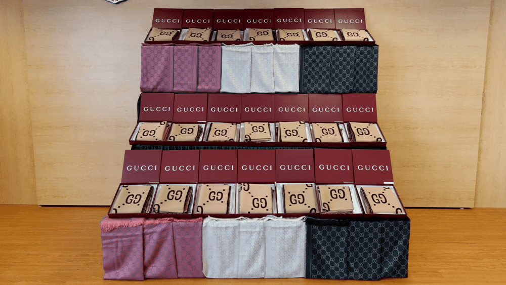 During these inspections, customs officers discovered around 11,000 items suspected to be counterfeit, including an array of Gucci scarves and clothing, with an estimated market value of about HK$5.8 million.