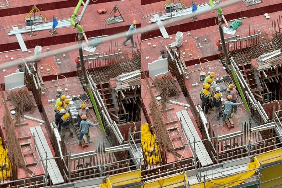 Two men confront one another, while two additional workers attempt to mediate the situation. Meanwhile, another worker continues to pour concrete, seemingly undisturbed by the fracas.