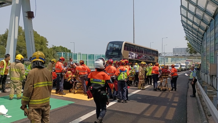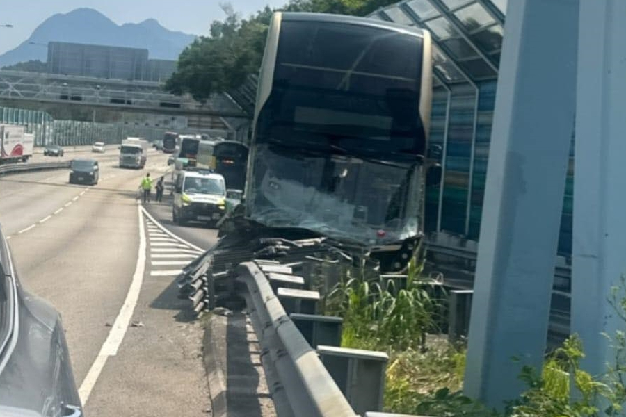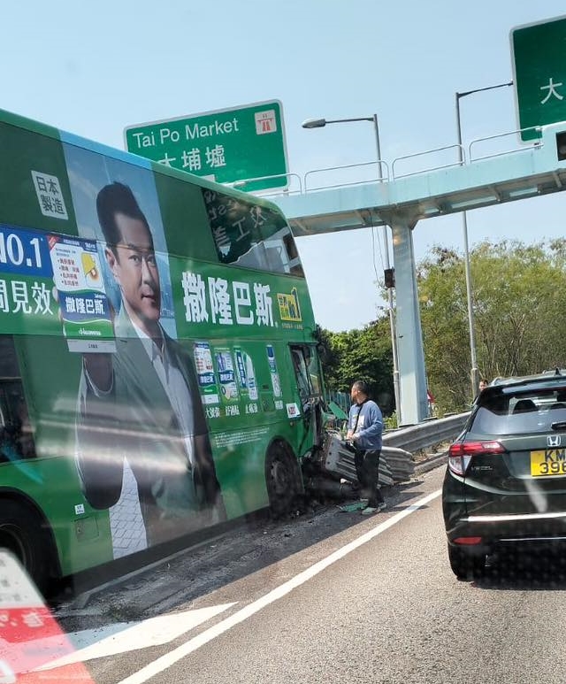 The incident occurred around 12.15pm, when a KMB bus -- on route 74X Sheung Shui bound -- crashed into a crash cushion on a slip road to Tai Po market, causing damage to the front end of the double-decker.