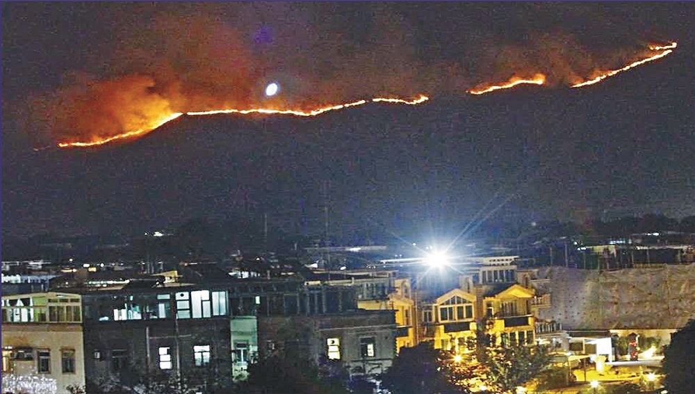 It was among 104 hill fires reported to the Fire Services Department from Sunday to 5pm yesterday amid a yellow fire danger warning. Hill fires also erupted in Tuen Mun, Mai Po, Tai Po, Ma On Shan and Sha Tau Kok, but was later put out by firemen.