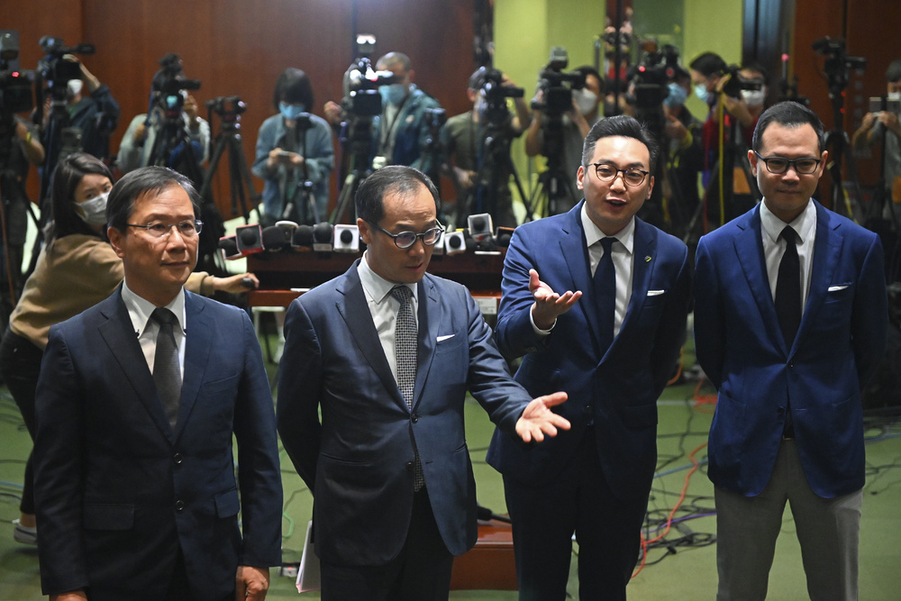 During the news conference, the 15 lawmakers held hands and chanted: "Hong Kong add oil! Together we stand!'' The phrase "add oil'' is a direct translation of a Chinese expression of encouragement.