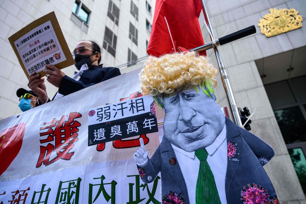 The BNO door opens in North Point as pro-Beijing activists lambast British Prime Minister Boris Johnson in Admiralty.