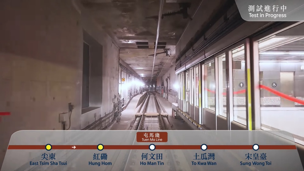 The video shows the train passing through five stations - East Tsim Sha Tsui, Hung Hom, Ho Man Tin and the two new ones, To Kwa Wan and Sung Wong Toi.