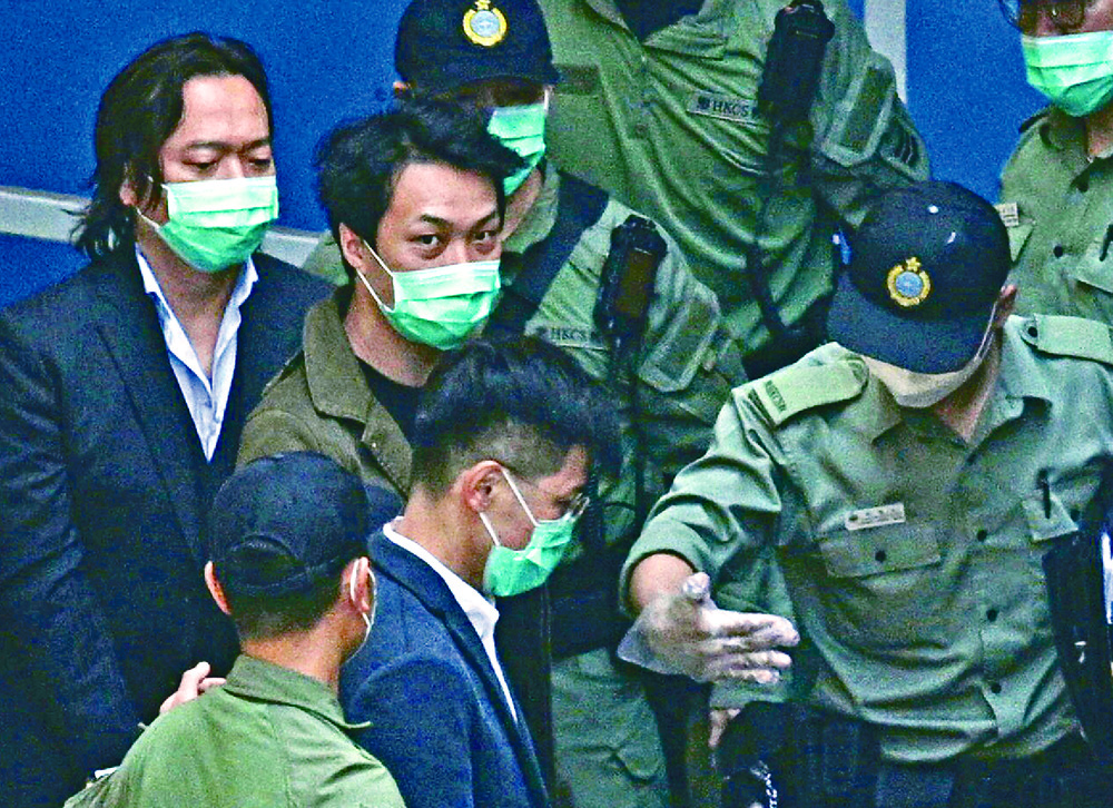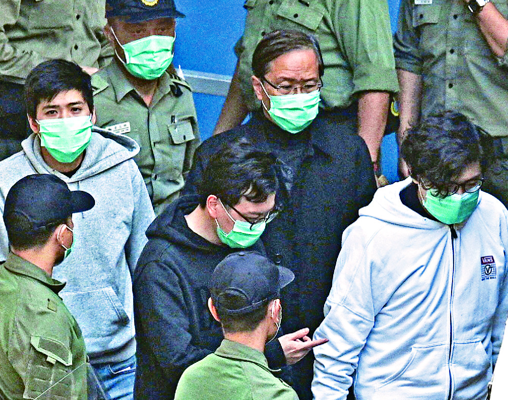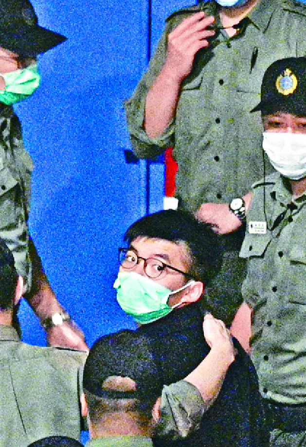 On their way to court are, from far left, Lawrence Lau, Jimmy Sham, Gary Fan, Lester Shum, Kalvin Ho, Kwok Ka-ki and Sam Cheung. Returning to Lai Chi Kok is Joshua Wong. SING TAO