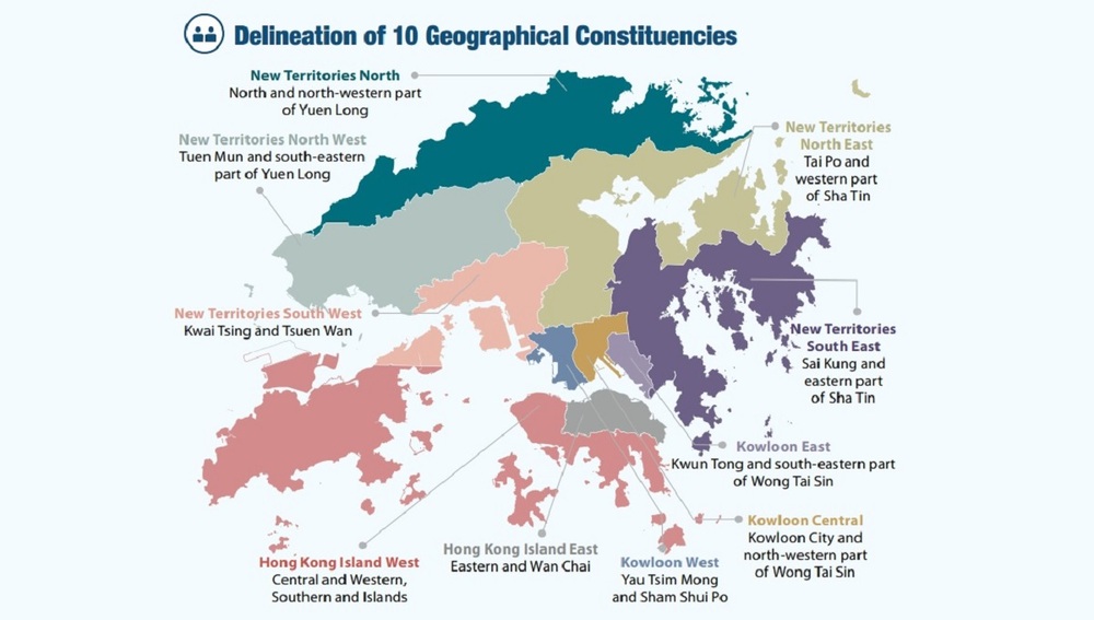 A total of 10 geographical constituencies will be carved out for 20 Legco seats: five in the New Territories (New Territories North, North West, South West, North East and South East), three in Kowloon (Kowloon East, Central and West) and two on Hong Kong Island (Hong Kong Island East and West).