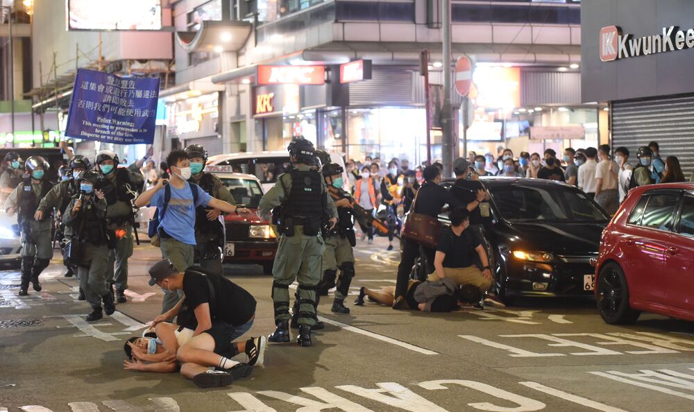 Police move in during the June 12 protest in Mong Kok. Left: the 2019 arson incident .