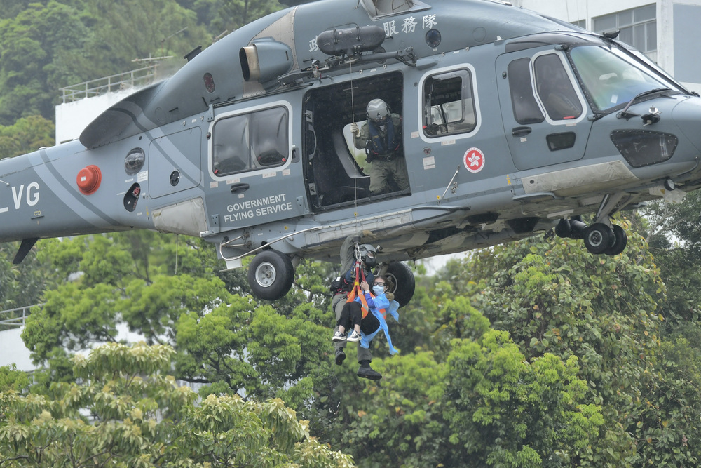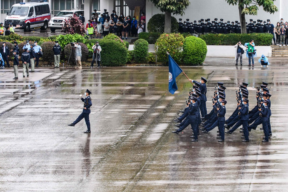 At the Hong Kong Police College in Wong Chuk Hang, flag bearers showcased the foot drills in the flag-raising ceremony as heavyweights such as Commissioner of Police Chris Tang Ping-keung watched.