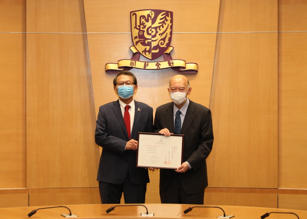 Rocky Tuan, far left, presents retired chief justice Geoffrey Ma with a certificate of appointment as an honorary professor of law at Chinese University.