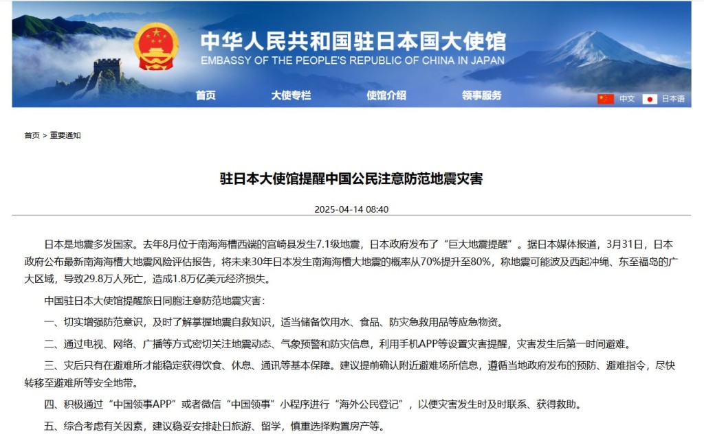 In an official notice released Monday, the embassy highlighted Japan's high earthquake risk, referencing a 7.1-magnitude quake in Miyazaki Prefecture last August that prompted a government earthquake alert.