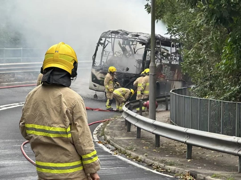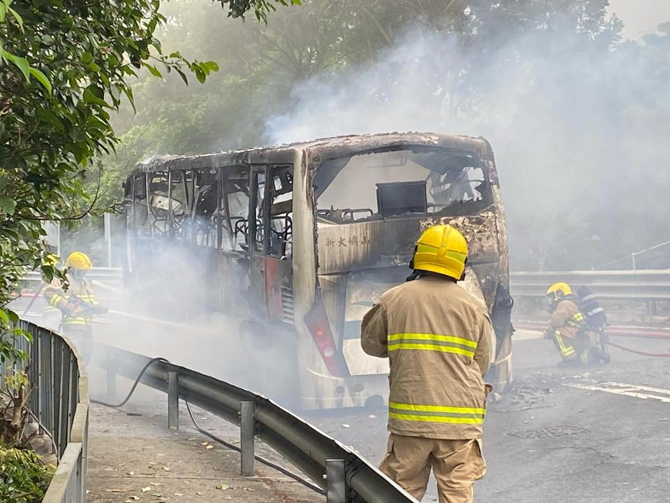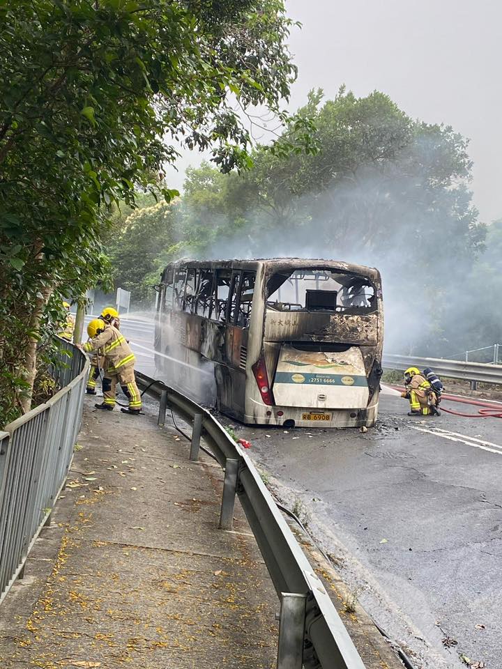 A dramatic bus fire brought traffic to a standstill on Tung Chung Road this morning when a New Lantao Bus (NLB) single-decker suddenly burst into flames near Shek Mun Kap.