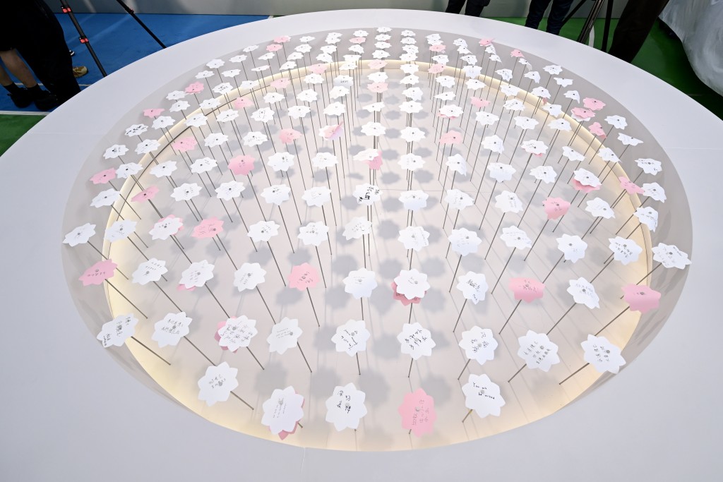 The memorial features a 12-meter-long and 5-meter-high altar adorned with white flowers, creating an elegant and solemn atmosphere.