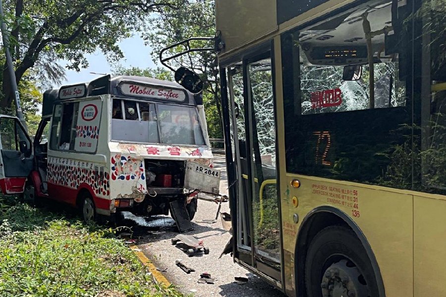 Today, at approximately 1pm, a Route 72 KMB bus traveling along Tai Po Road towards Kowloon collided with an ice cream truck in front of Kam Shan Country Park.