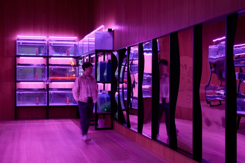 Upon entering the exhibition, visitors are transported to an abandoned pet fish shop illuminated by purple lights. Mirrored walls reflect their presence into the installation, casting them as participants within the scene, perhaps as a fish, a customer, or a fish seller.
