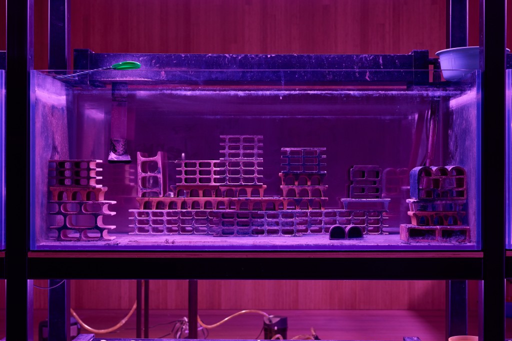 Behind the racks of tanks stands the artwork Little Comfy Tornado (After Typhoon), featuring a broken filtration system that once regulated the delicate environment fish require to survive, which serves as a warning about the consequences of neglect.