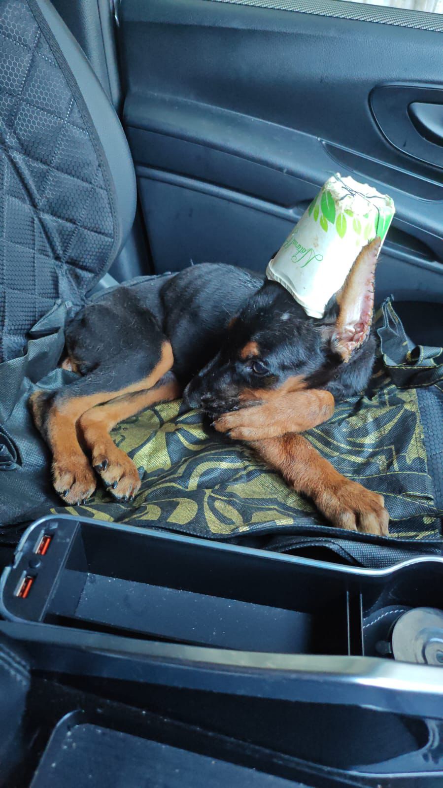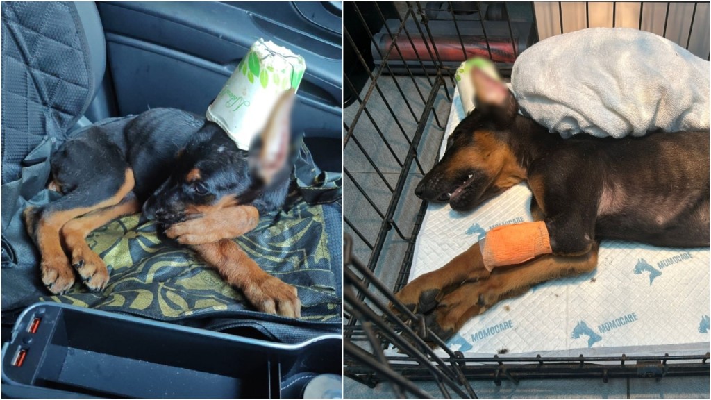 The rescuer, Leung, found the dog under a park bench with her ears mutilated—each bearing an approximately 8 cm-long incision, poorly stitched and inflamed. Shockingly, white paper cups had been glued to her ears, likely to force them upright.