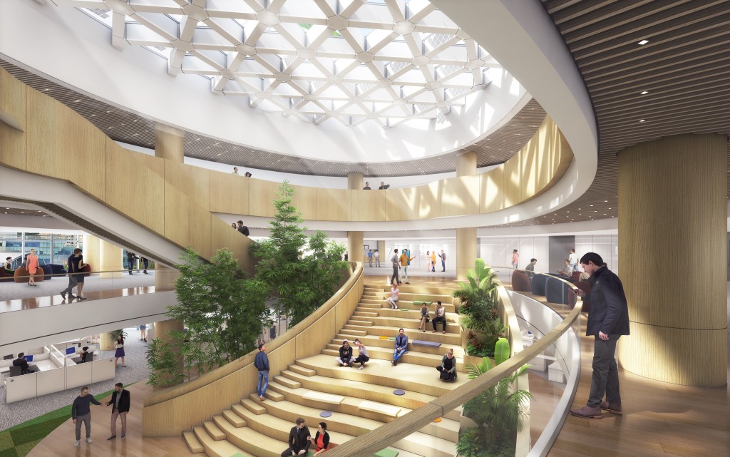 The new building showcases a cascading, curvilinear design that integrates atriums, skylights, and outdoor terraces. Inside, it offers flexible workspaces and purpose-built collaborative zones, all connected to the adjacent campus via elevated walkways.