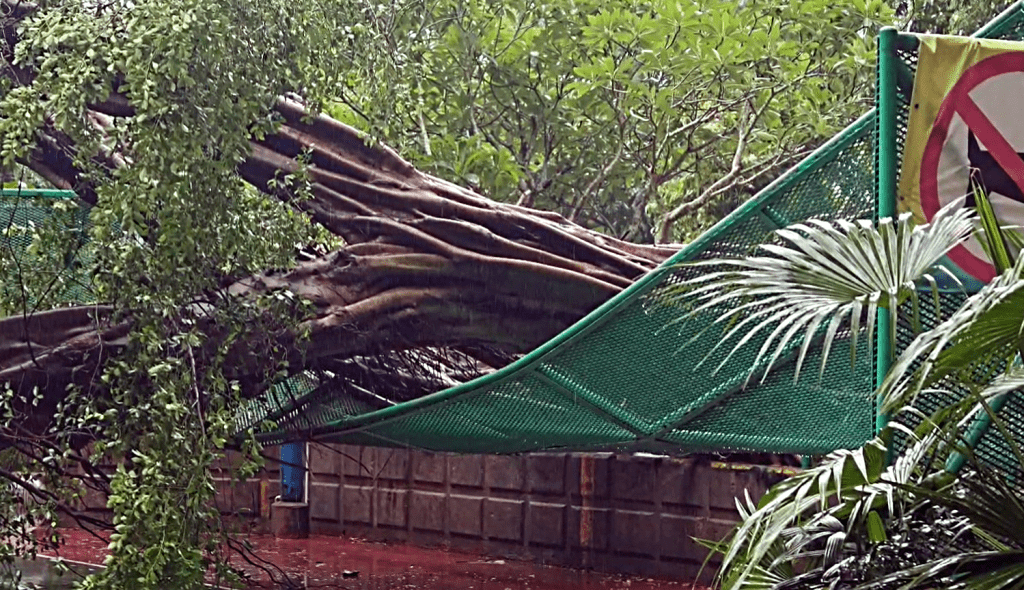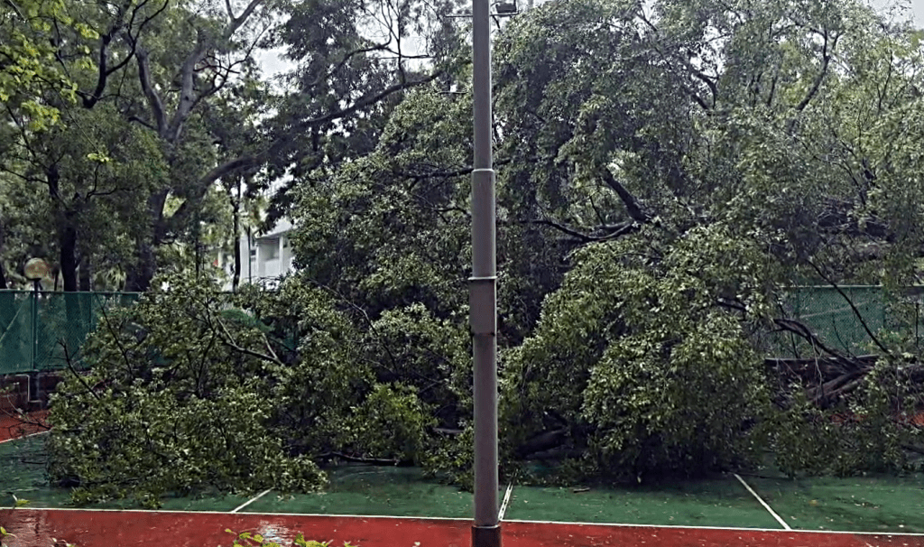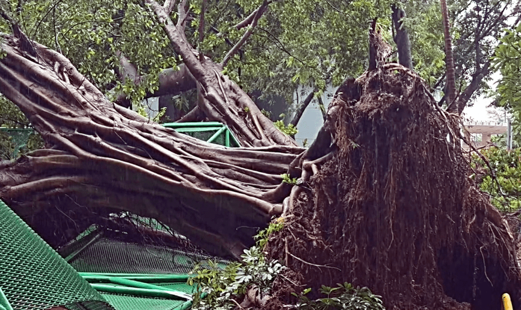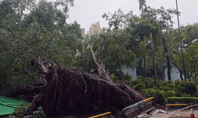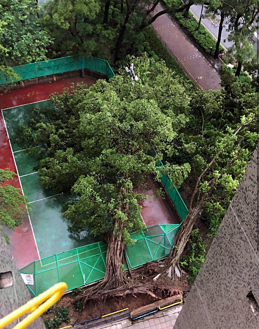 A giant tree toppled onto a court near Tin Ping Estate, Sheung Shui during the severe rainfall on Tuesday.