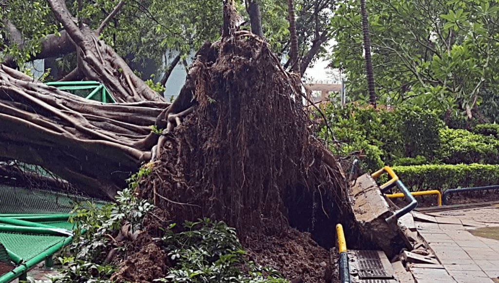 The uprooted tree near Tin Yee House also damaged surrounding infrastructure, tearing up railings, paving tiles, and metal covers. No injuries were reported.