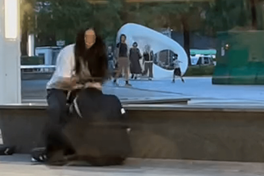 The clip begins with the woman gripping the man’s hair and forcing him to the ground before relentlessly punching his head.