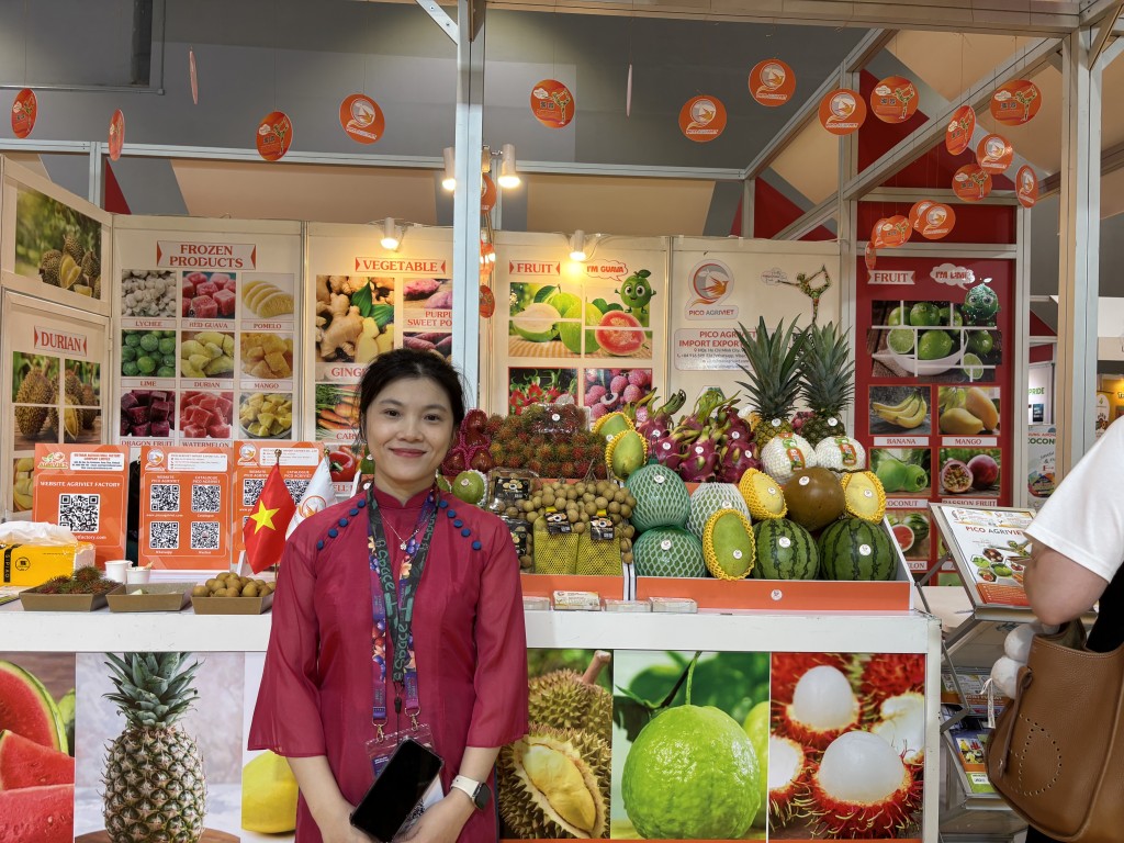 Anna, from the Vietnamese fruit exporter Pico Agriviet, shared that the company primarily exports fruits like pomegranates, durians, longans, and coconuts to Malaysia, China, Taiwan, and Hong Kong.