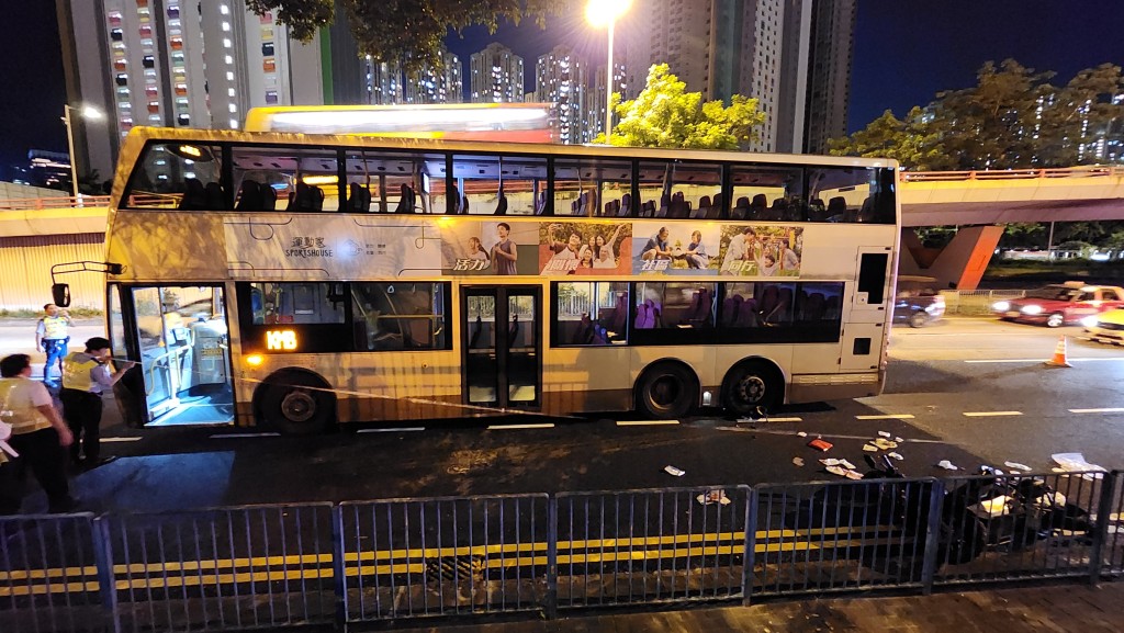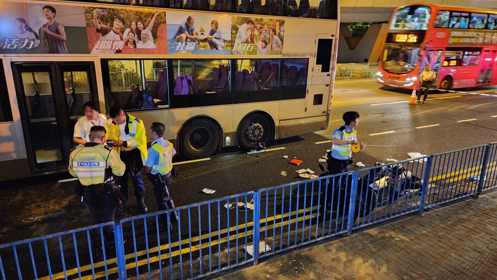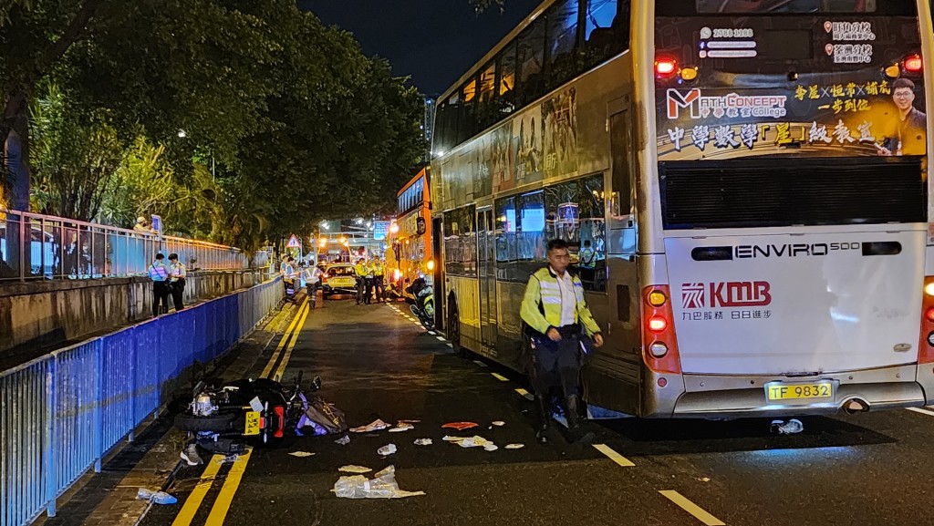 KMB responded to inquiries stating that at approximately 8:30pm, one of their buses was traveling in the second lane of Kwun Tong Road near Tsui Shek House of Ping Shek Estate when a motorcycle in the first lane allegedly changed lanes and made contact with the bus's left side, causing the rider to lose balance and subsequently collide with another KMB bus following behind.