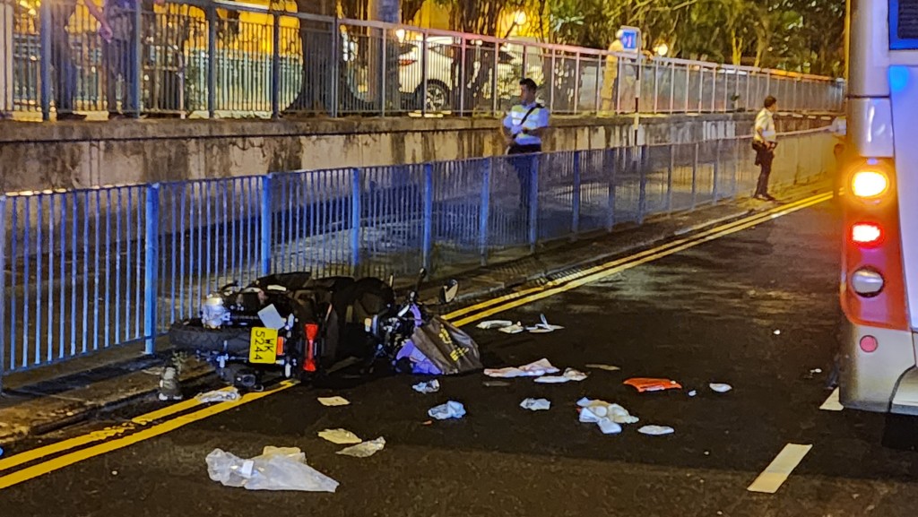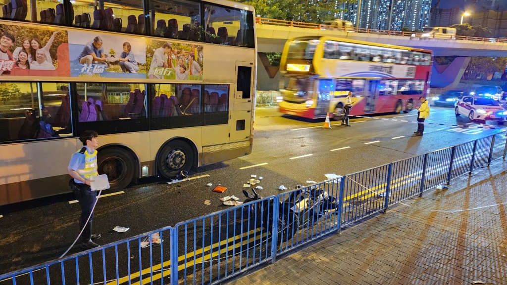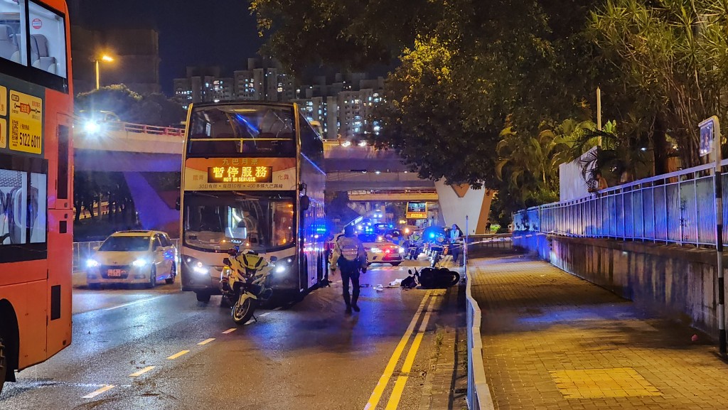 The accident occurred at about 8pm when the motorcycle was traveling along Kwun Tong Road toward Kwun Tong near Ping Shek Estate. The rider was thrown from his vehicle after a collision with a bus and subsequently run over by another approaching KMB bus that couldn't stop in time.