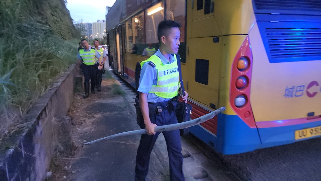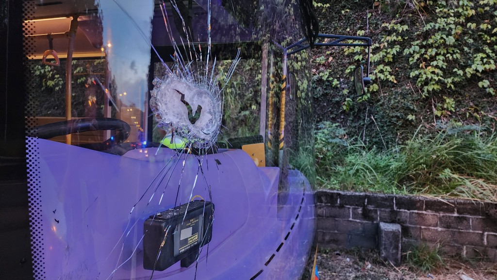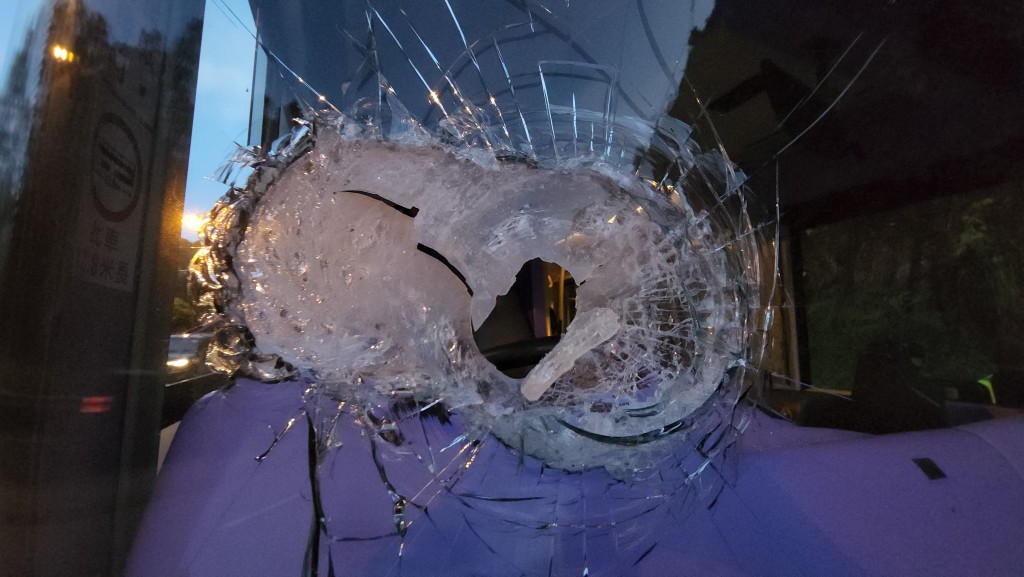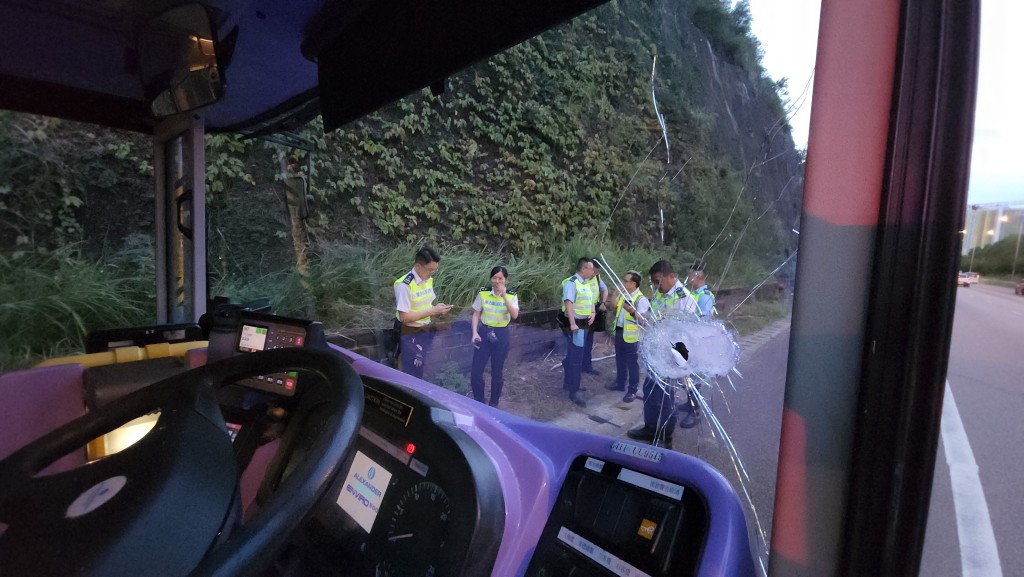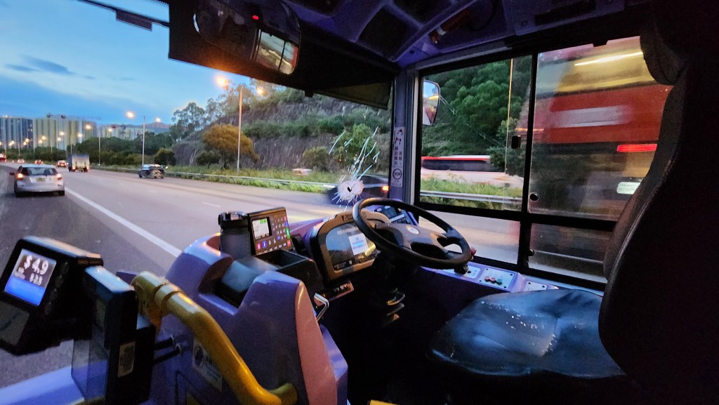The incident occurred around 5pm today as the bus, traveling toward Yuen Long near the Tai Lam Tunnel Bus-Bus Interchange, was hit by a 1.5-meter-long metal rod that smashed through the right side of the windshield.