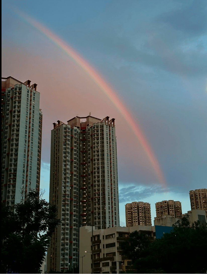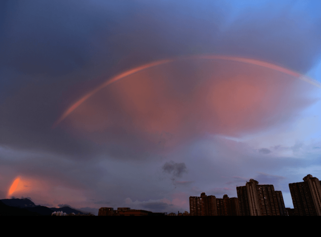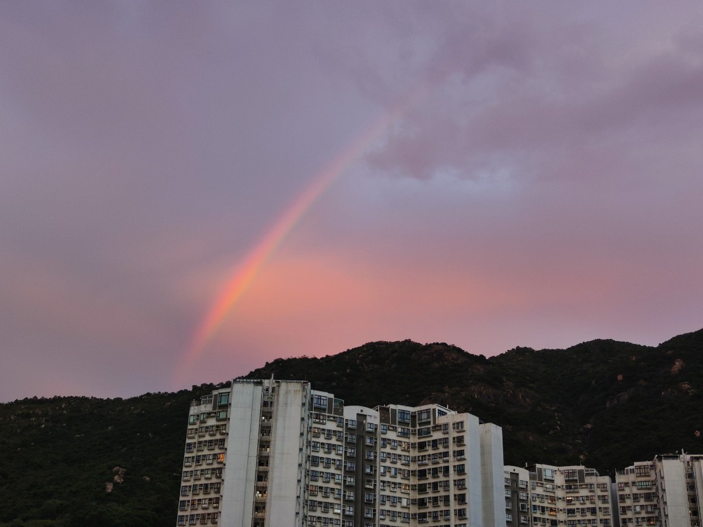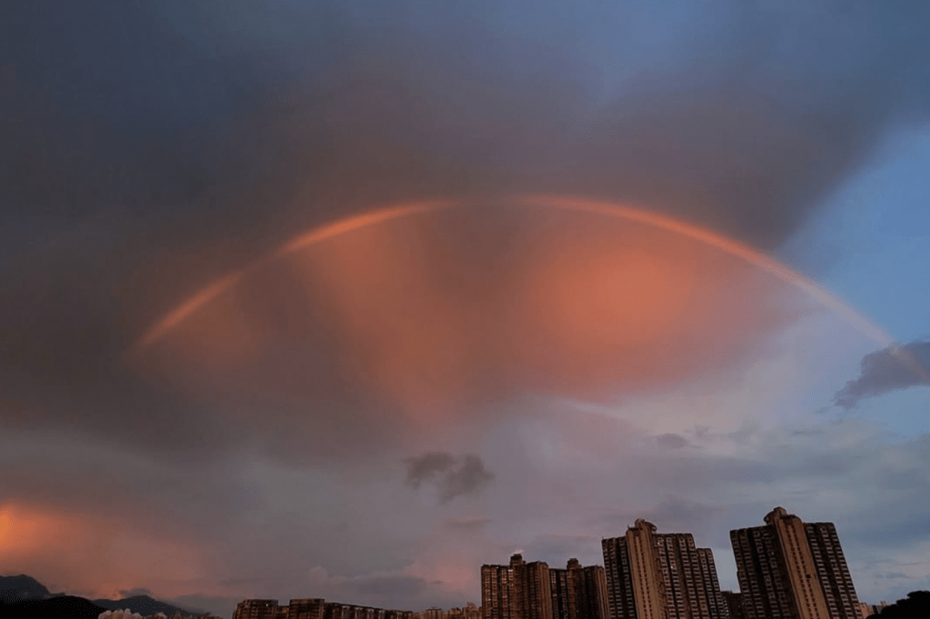 Despite the approaching storm, social media photos revealed beautiful rainbows appearing across multiple Hong Kong districts following Thursday's No. 1 typhoon signal. The "Community Weather Observation Scheme" Facebook group shared images of rainbows in Tai Po and Tin Shui Wai, while other users posted photos of striking fiery red skies over Hong Kong Island and the Northern District during evening hours, demonstrating that even typhoon conditions can create spectacular visual displays.