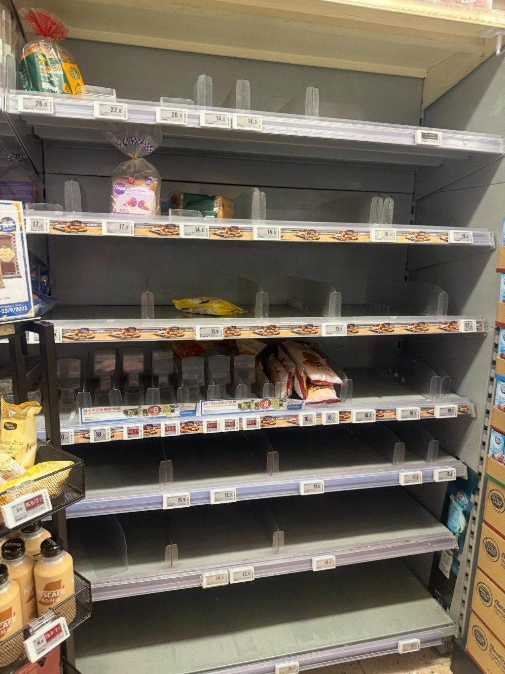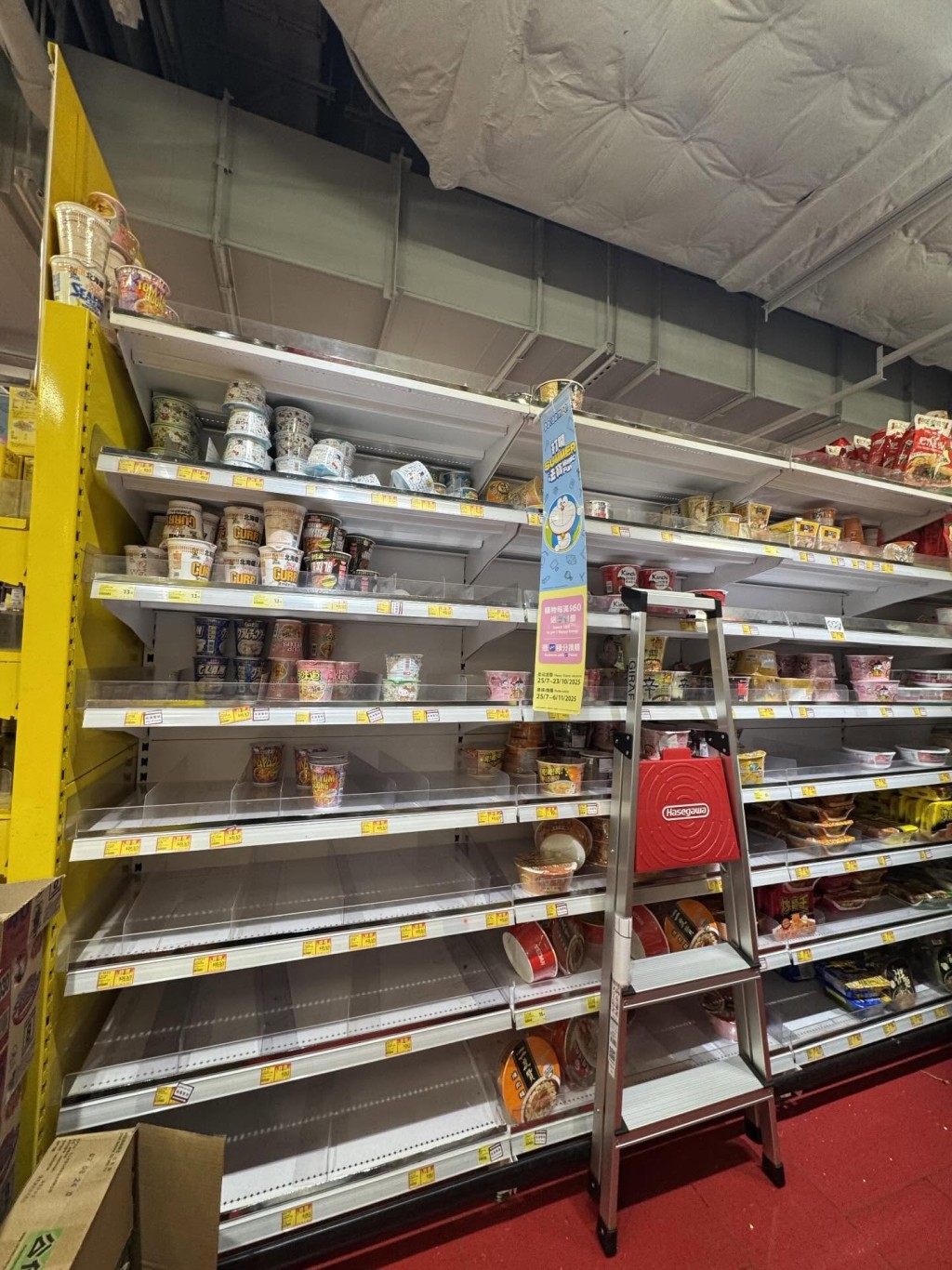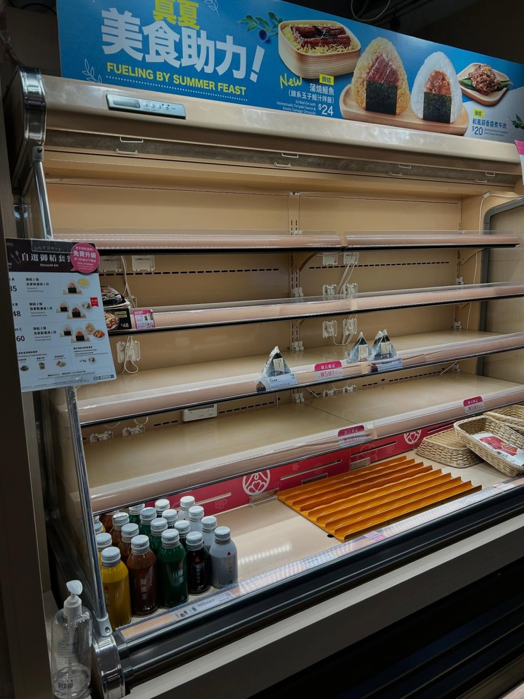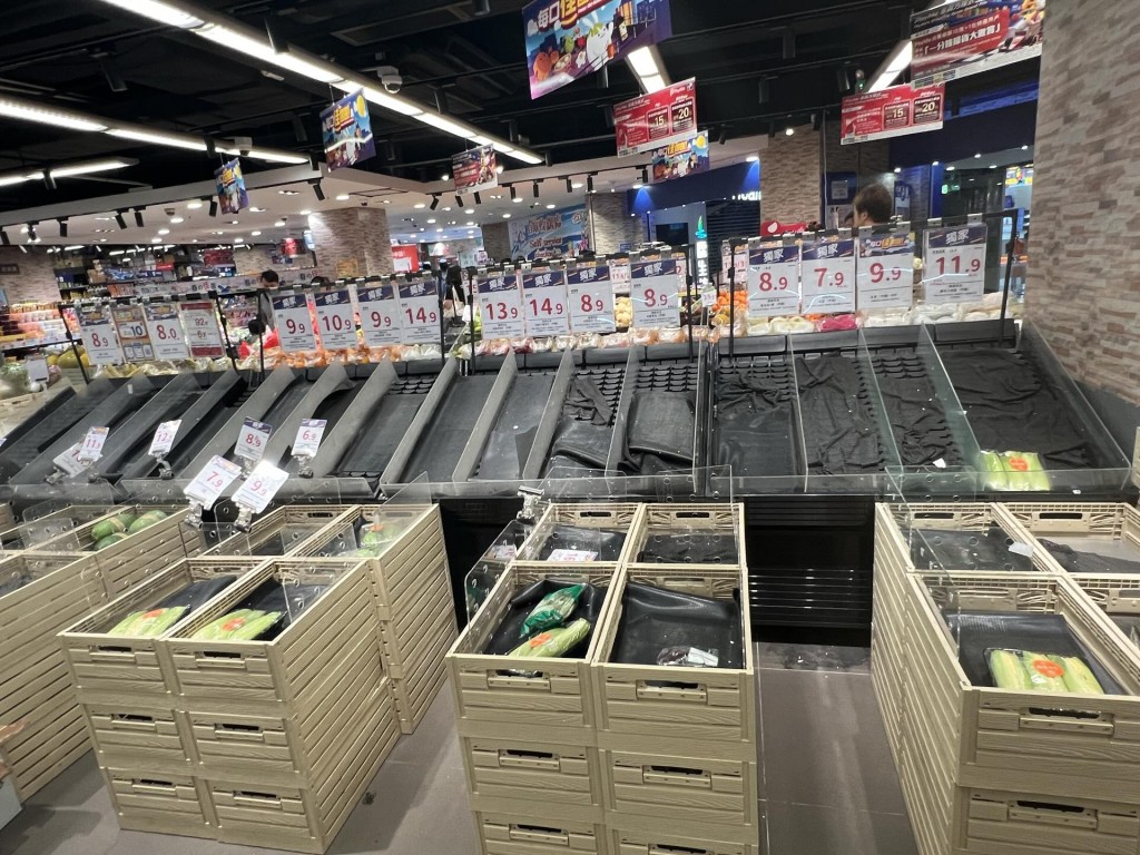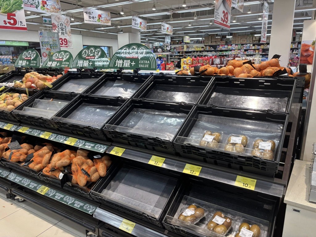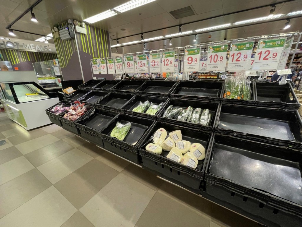 Supermarket aisles that once held fresh vegetables, meat, and bread now sit nearly empty, with even premium-priced organic vegetables, selling at HK$27 a pack, being swept into shopping carts.