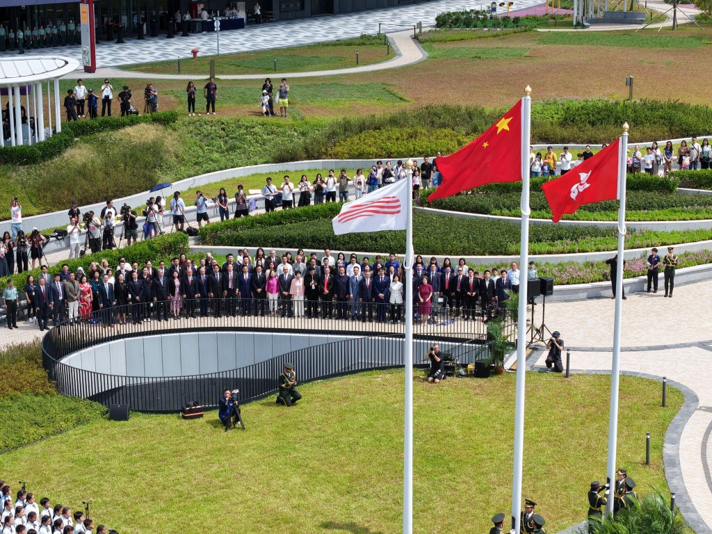 The event reached a peak moment when clear voices of students from Po Leung Kuk Lam Man Chan English Primary School began singing the national anthem, coinciding with the national flag being raised steadily to full mast.